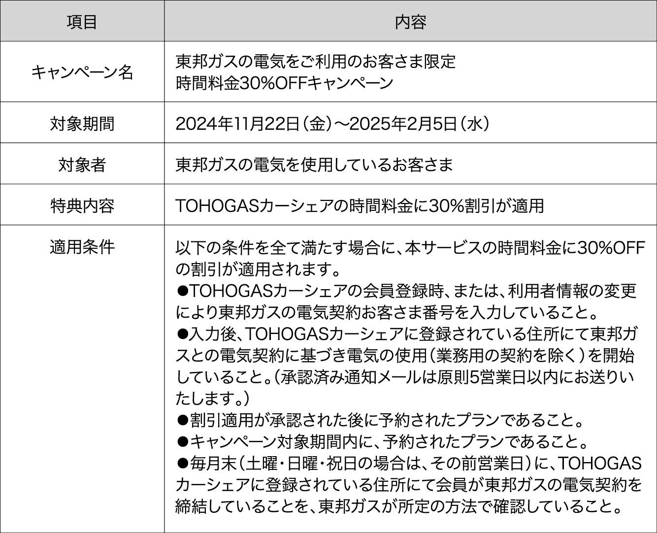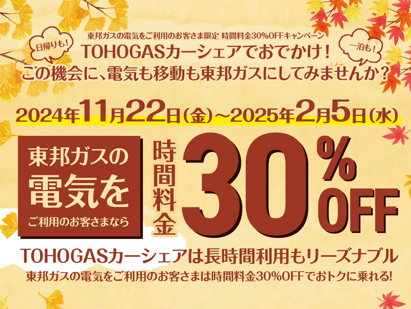 東邦ガス株式会社(社長:増田信之)は、2024年11月22日(金)から2025年2月5日(水)にかけて、TOHOGASカーシェアの時間料金が30%OFFになるキャンペーンを行います。なお、この割引は東邦ガスの電気をご利用のお客さまを対象としております。