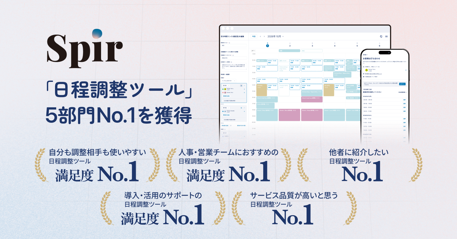 日程調整ツール「Spir(スピア)」を展開する株式会社Spir(東京都中央区、代表取締役:大山晋輔、以下当社)は、日本マーケティングリサーチ機構が実施した「2026 年 3 月期_日程調整ツールに関する満足度調査」において、以下の5部門すべてでNo.1を獲得したことをお知らせいたします。