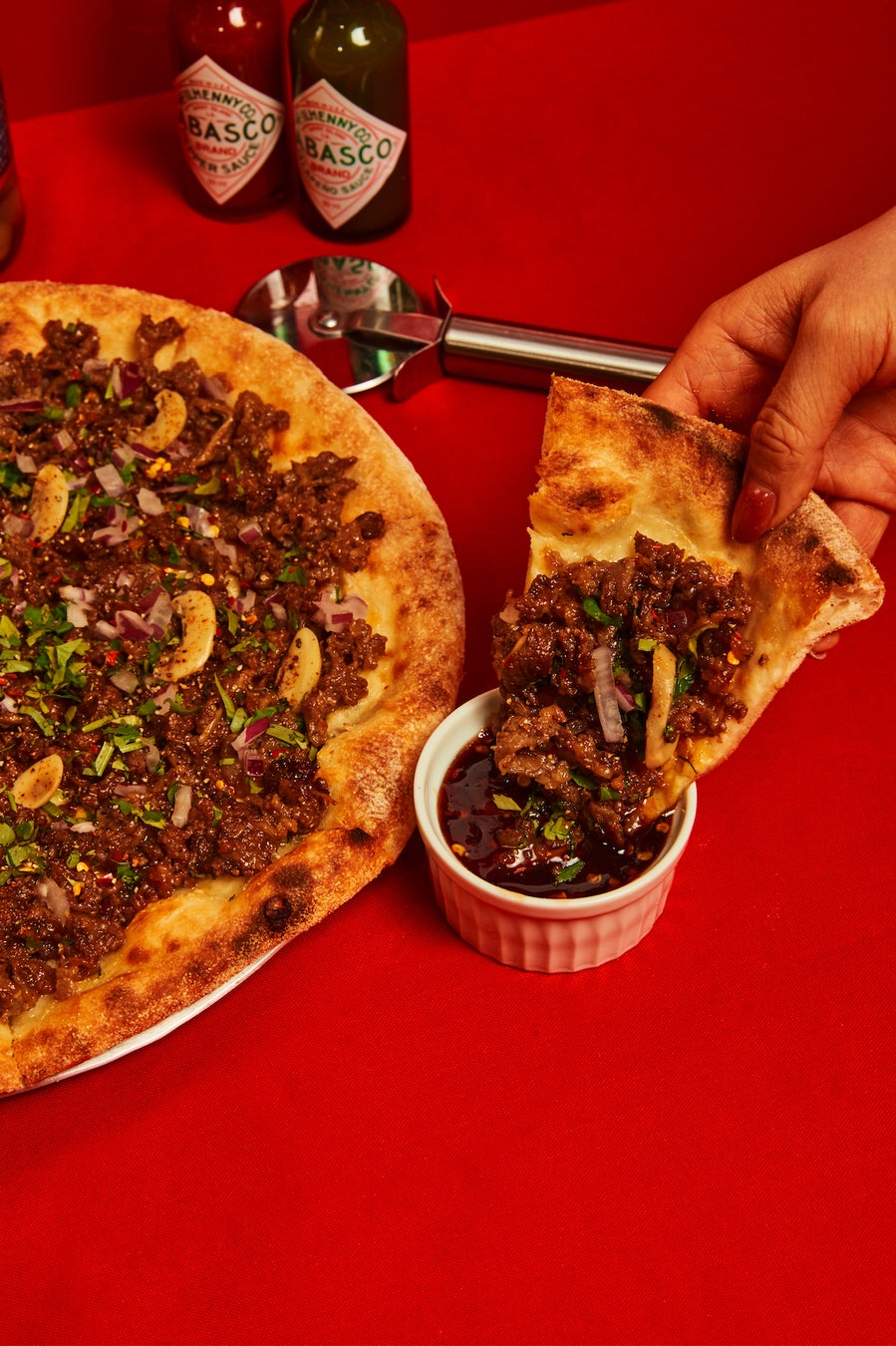 オリジナルのソースにピザをつけて食べることで、組み合わせは無限大。