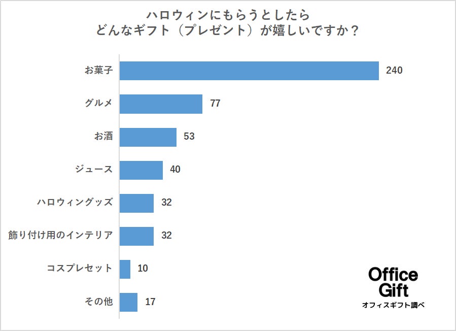 また、「ハロウィンにもらうとしたら、どんなギフト(プレゼント)が嬉しいか」についてアンケート調査をしたところ、以下のような結果となりました。