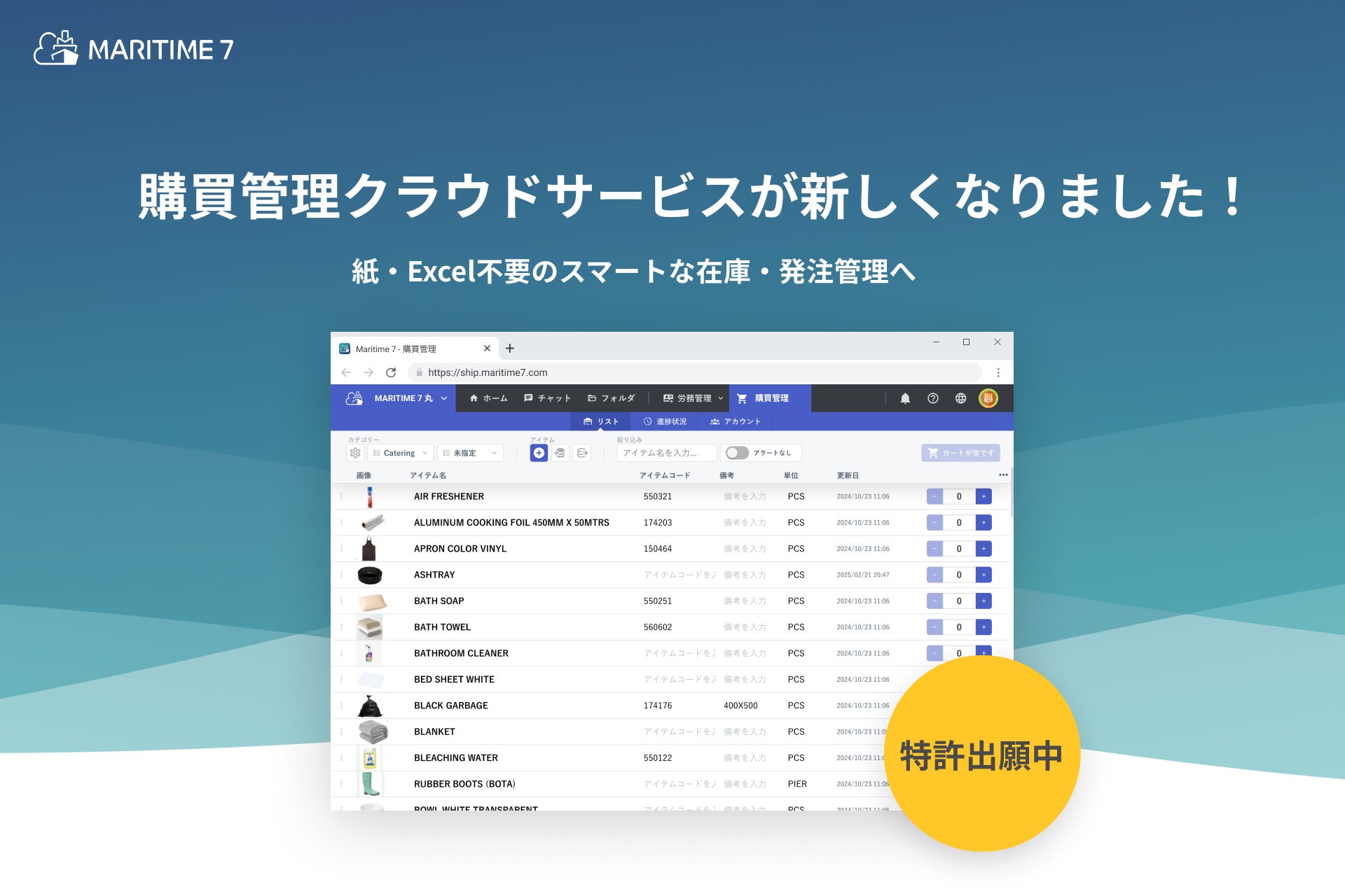 株式会社ザブーン(本社:東京都港区新橋、代表取締役:戸高克也)は、船舶管理クラウドサービス「MARITIME 7」の購買管理機能をリニューアルしました。より操作性の高いUI/UXを採用し、現場の運用に沿ったユーザビリティを実現。部品や船用品の在庫管理からオーダー管理まで陸上と船舶間のやり取りをシームレスに一元管理することが可能になります。