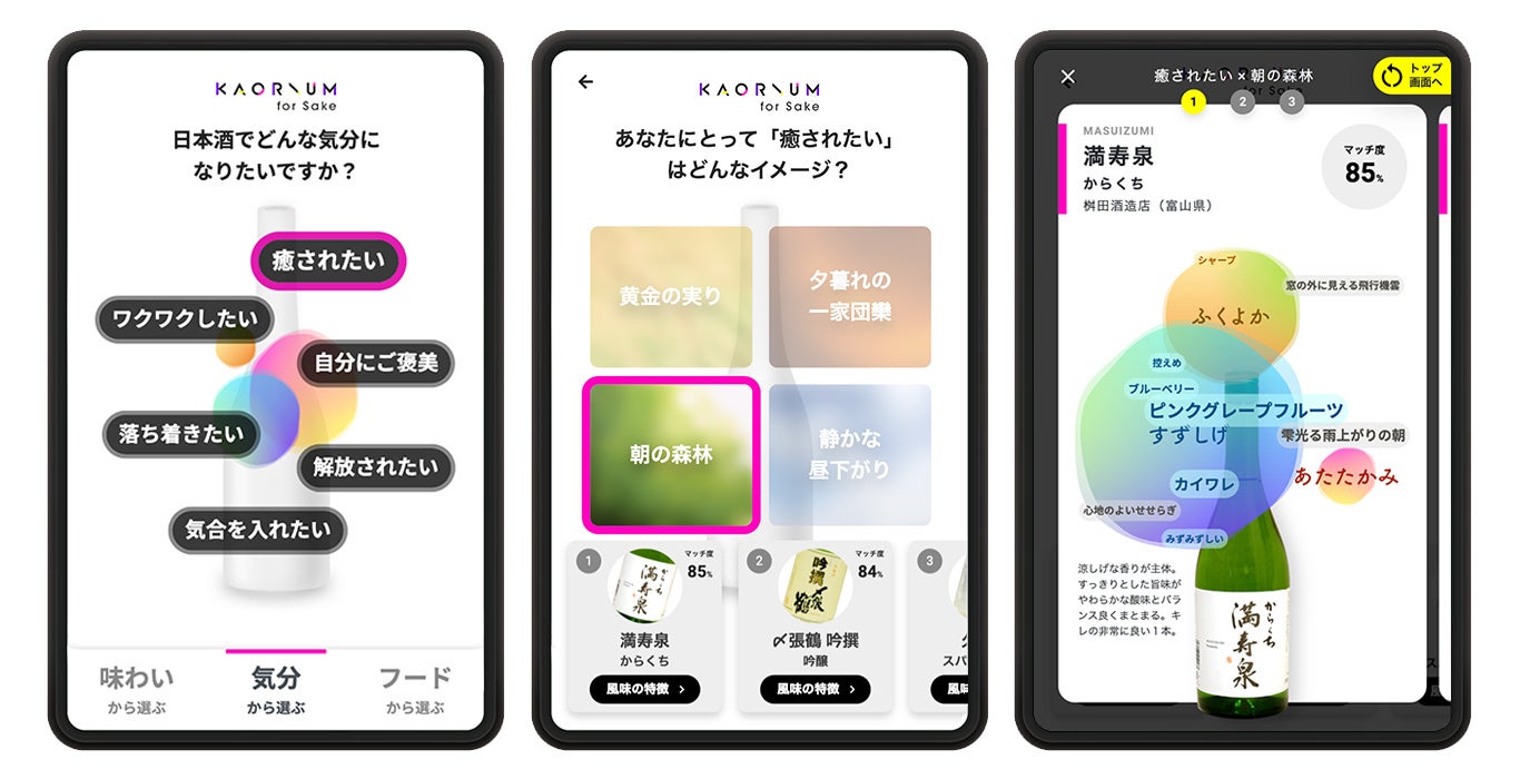 人の香りの感じ方を学習しデータ化した日本酒ソムリエ AI「KAORIUM for Sake」は、人間の感性を日本酒とマッチすることができるAI システムです。「味わい」「気分」「フード」の3つのメニューがあり、日本酒を選ぶことができます。