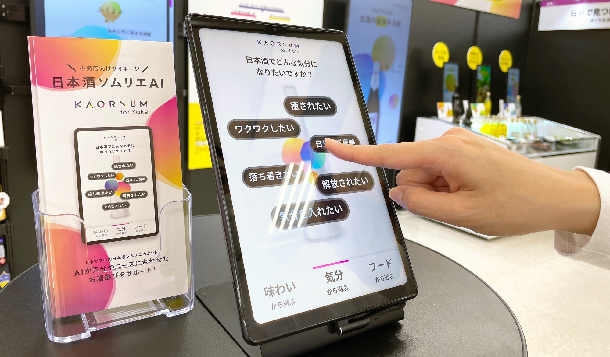 「気分から選ぶ」では、「自分へのご褒美」「気合を入れたい」などの選択肢があり、その日の気分に合 わせて1つを選ぶと、店頭にある日本酒とのマッチ度を計算し、マッチ度の高い日本酒 3 種類をレコメンドします。この技術により、これまでは経験と感性を 持った利酒師やソムリエだけが可能であった「人間の感性にそった楽しいお酒選び」という接客体験が小売店の店頭でも実現可能になります。また、気分やニーズから選ぶだけではなく「KAORIUM for Sake」では、膨大な風味表現データによる日本酒表現を実現します。「フルーティなお酒」というアバウトな表現ではなく、「白ぶどうのような風味を持ったお酒」というように、日本酒銘柄ごとに具体的な「風味マップ」としてビジュアライズすることで、自分が好きなお酒や飲んでみたい風味をより具体的に探すことが可能になります。日本酒の風味データは、各日本酒の銘柄の前にある風味カードとして持ち帰ることも可能です。