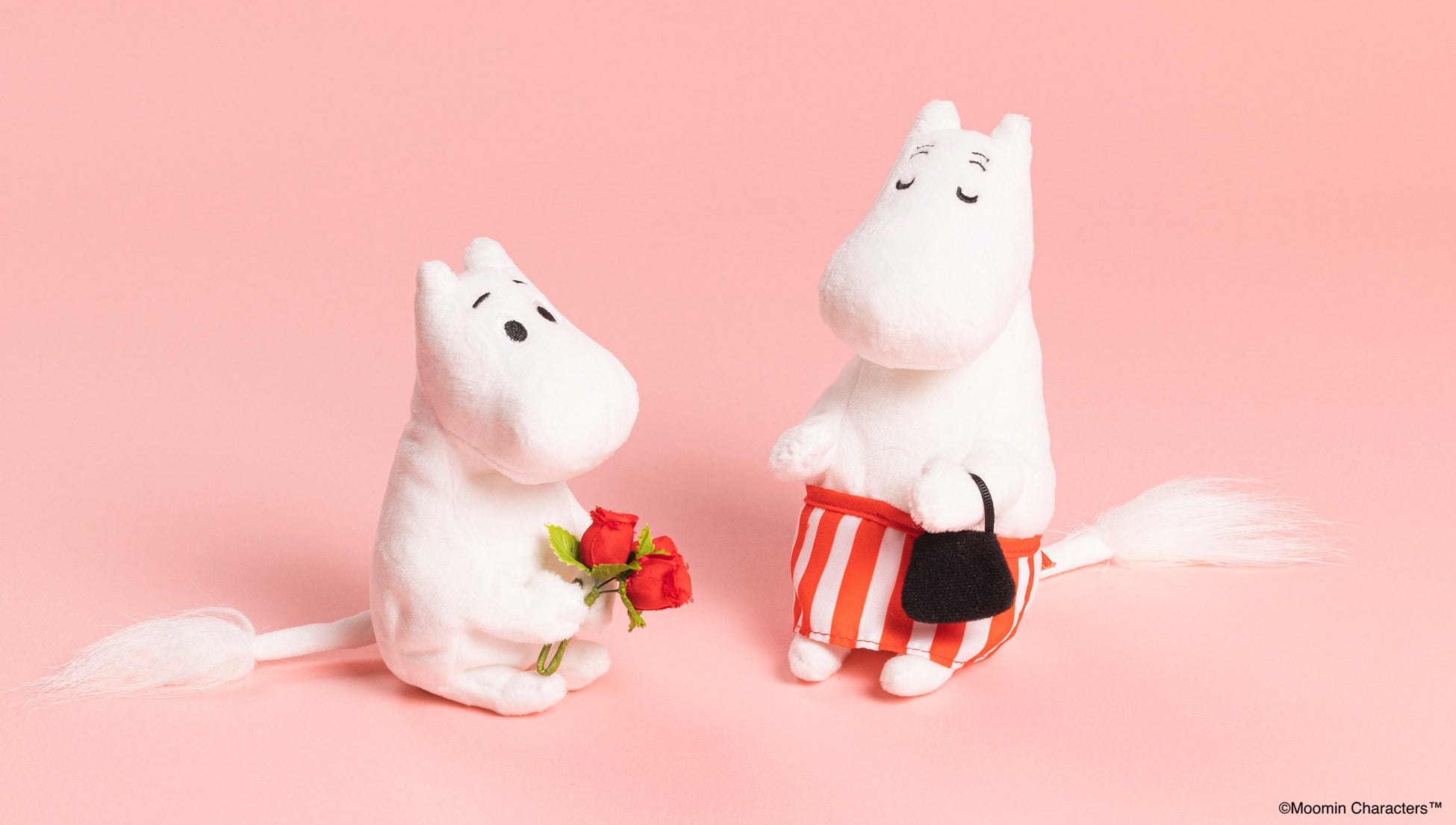 ムーミントロールが、ムーミンママにバラの花を渡しているほのぼのとしたぬいぐるみのセット。