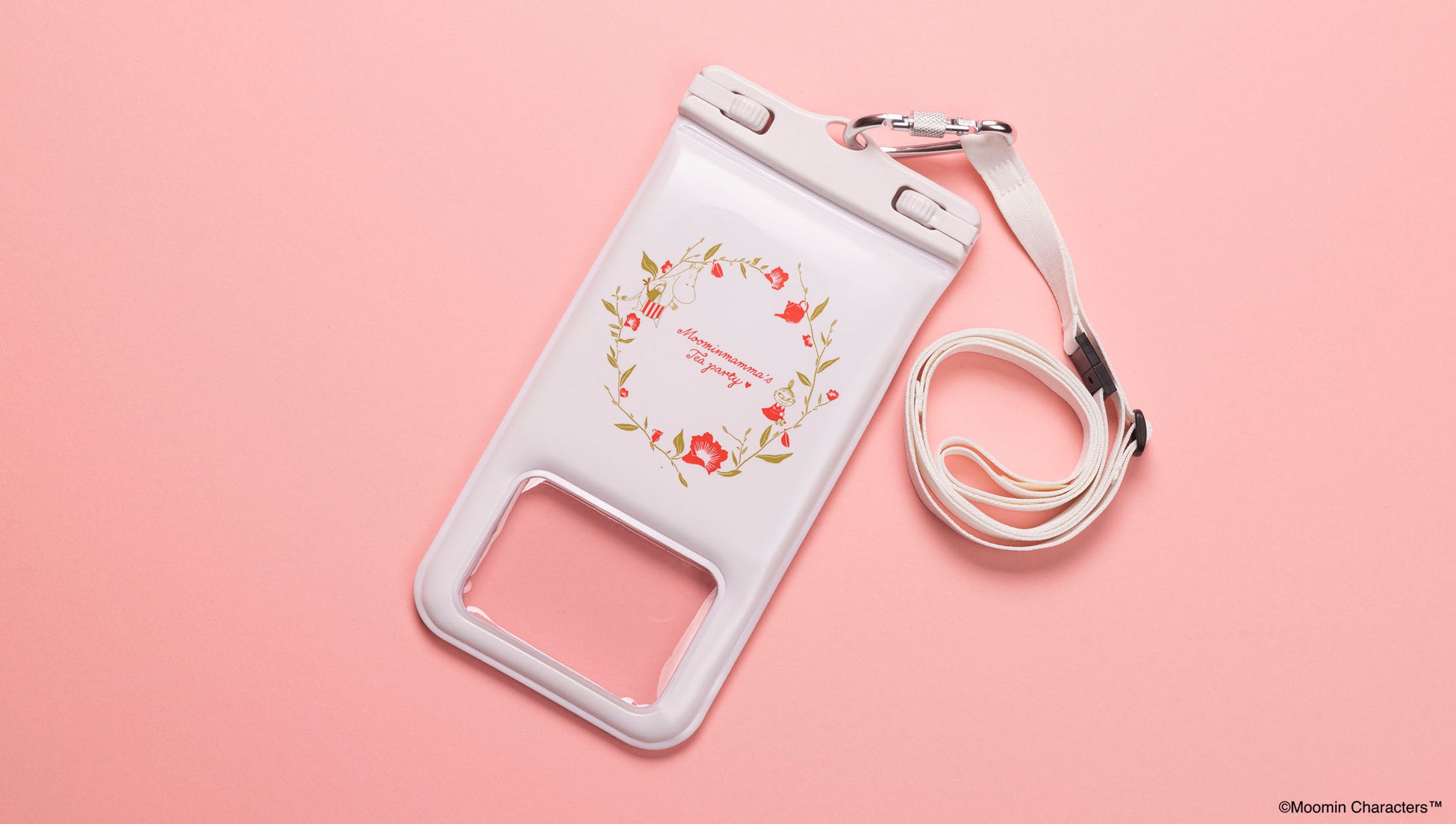 華やかなデザインがあしらわれた、斜め掛けもできるスマートフォン用防水ケース。