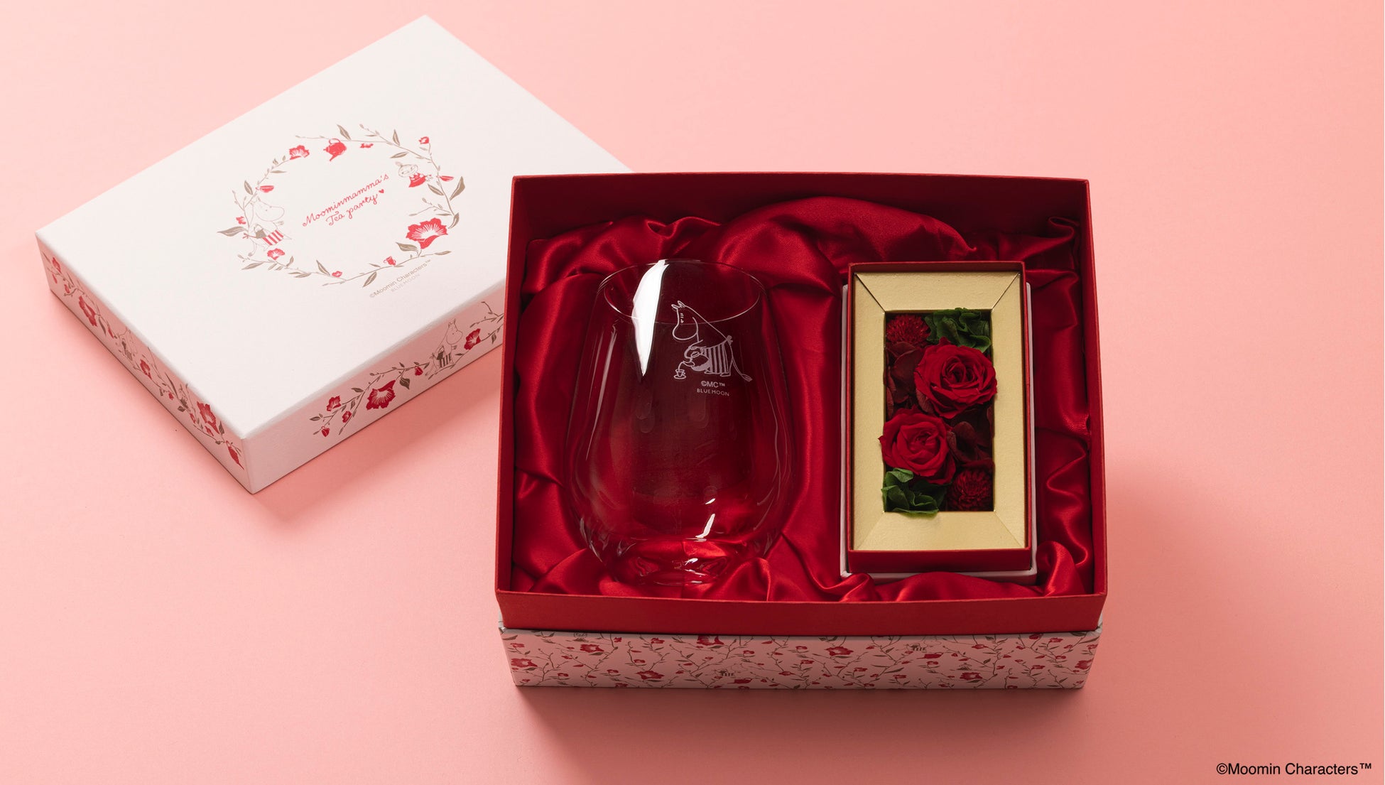 バラのプリザーブドフラワーと、タンブラーがセットになったゴージャスなギフトセット。
