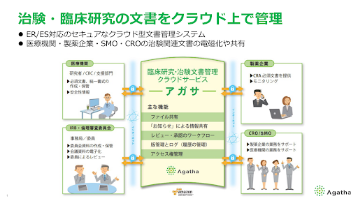 治験・臨床研究の文書をプロジェクト単位で共有し、管理・保存するためのクラウドサービス「Agatha」を、医療機関、製薬企業、医療機器企業、CRO、SMO、臨床検査会社などに提供することにより、治験・臨床研究の効率化・省力化に貢献することをミッションに掲げてスタートした会社です。