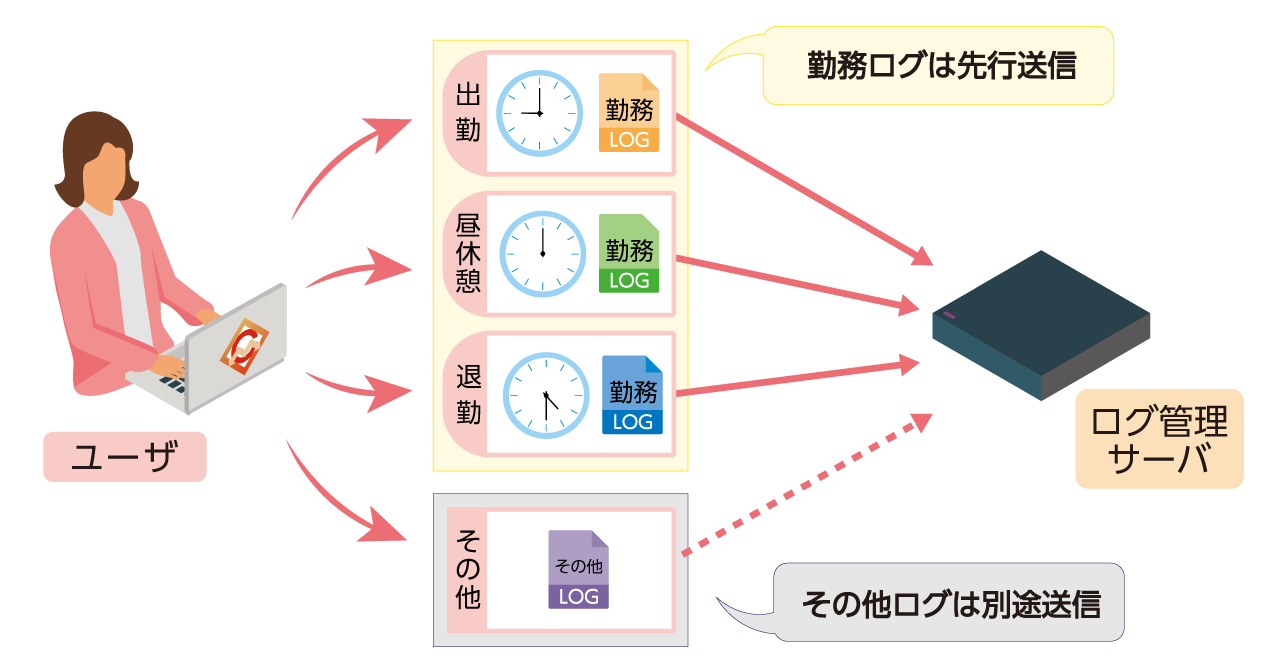 操作ログの送信・取り込み周期を操作ログの種類別に設定できる機能を追加しました(図2)。「勤務に関連する操作ログ」と「その他の操作ログ」に対して個別の送信設定が可能となり、例えば「勤務に関連する操作ログ」を先行送信する設定にすることで、当日分の勤務状態を把握できます。また、この機能によってログ管理サーバやネットワークの負荷を考慮しながら、操作ログの即時性を向上できます。なお、従来のように一日単位でまとめた定期処理でサーバに送信する設定も利用できますので、利用目的・運用環境に応じて柔軟な運用ができます。
