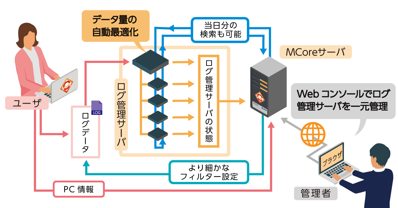 これらのニーズや課題に対応するためには、ログの中でもユーザによるさまざまなPC操作を記録した、操作ログの管理が重要です。そこで今回のVer.7.7では、これまでの操作ログ管理機能を強化し、勤務状況に関する操作ログが当日中に収集可能になりました。また、複数ログ管理サーバのデータ量を自動最適化する機能や、MCoreサーバにブラウザでアクセスするだけで、複数ログ管理サーバを一画面で管理できる一元管理機能を追加しました(図1)。