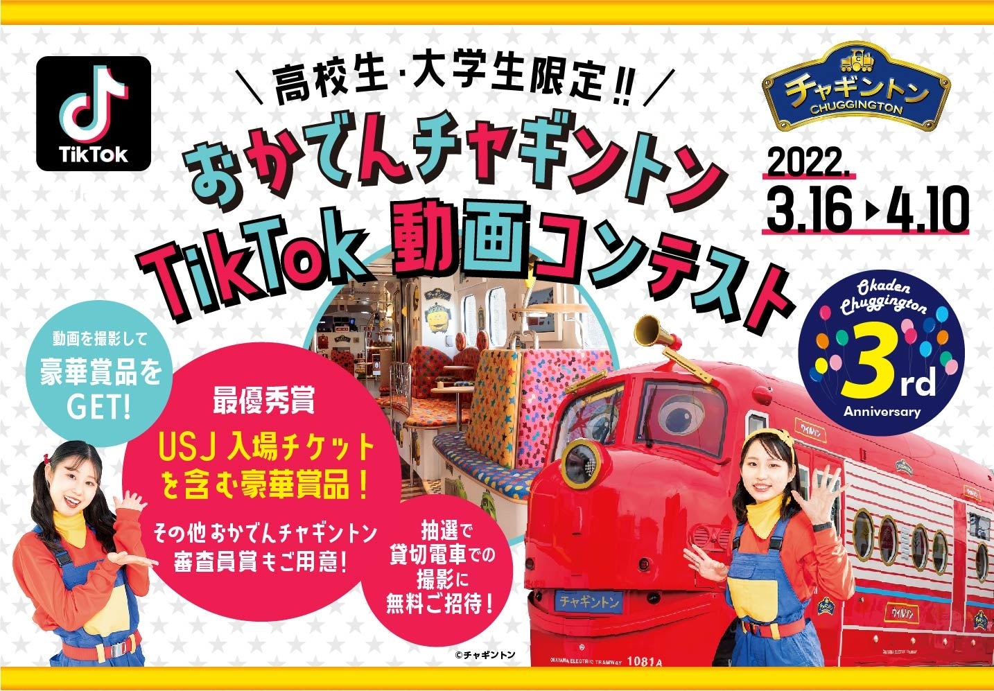 グループ代表兼CEO:小嶋光信)の岡山電気軌道株式会社(本社:岡山県岡山市中区徳吉町2丁目8-22、代表取締役社長:小嶋光信)では、2022年2月22日(火)から「高校生・大学生限定!!おかでんチャギントンTikTok動画コンテスト」の受付を開始いたします。本コンテストは、2022年3月16日(水)で運行開始3周年を迎える路面電車「おかでんチャギントン」(https://okaden-chuggington.com/)が、日頃のご愛顧に感謝を込めて、実施する記念企画の第一弾です。