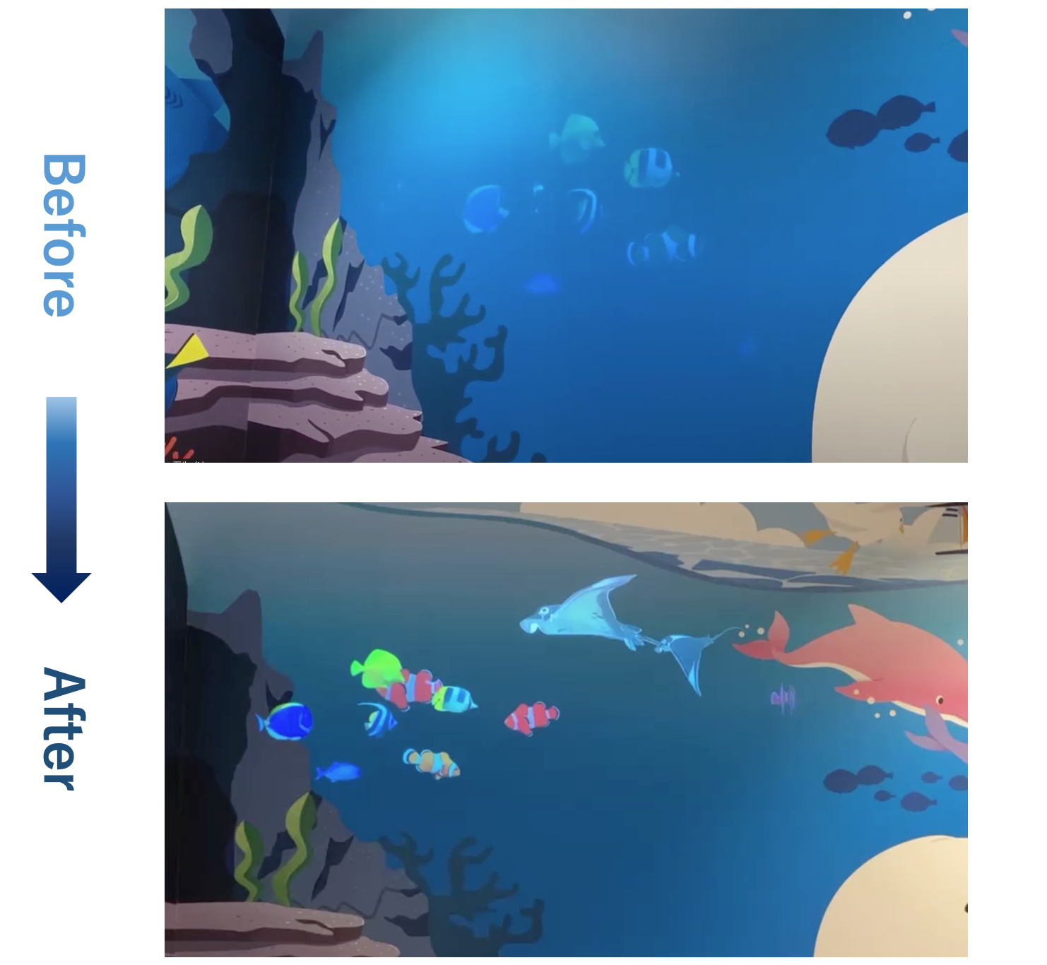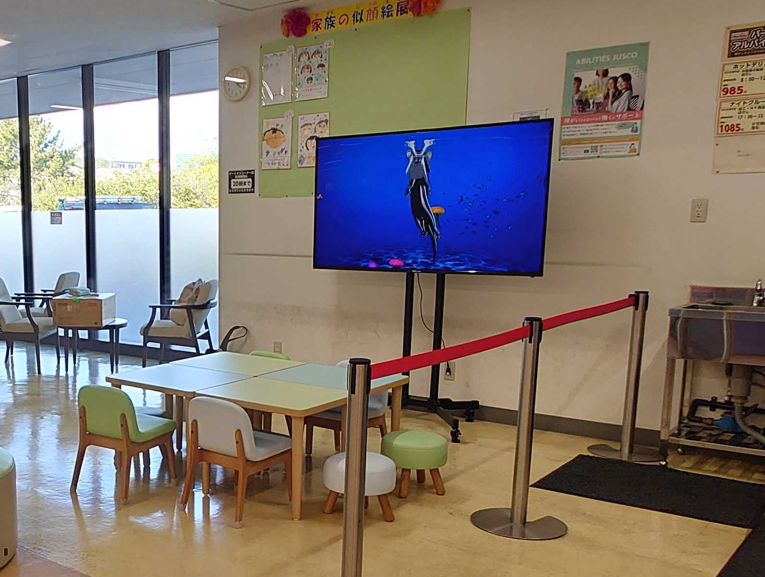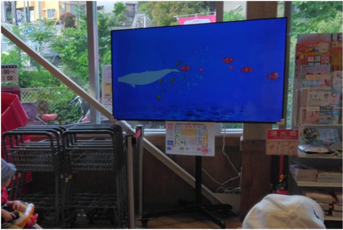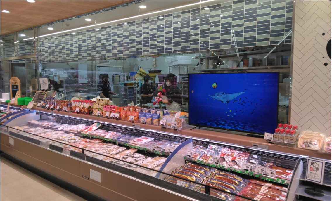 マックスバリュ関東が、2022年6月にリニューアルオープンした『マックスバリュ木更津請西店』では、「木更津の海」をモチーフにした、家族が一緒に楽しめるイートインスペース「Cafe&Dine/カフェアンドダイン」の壁面に描かれた海の中に、まるで実際の水族館にいるような臨場感のある映像表現をプロジェクションマッピングによる海の生き物たちのアニメーションにて実施してきました。