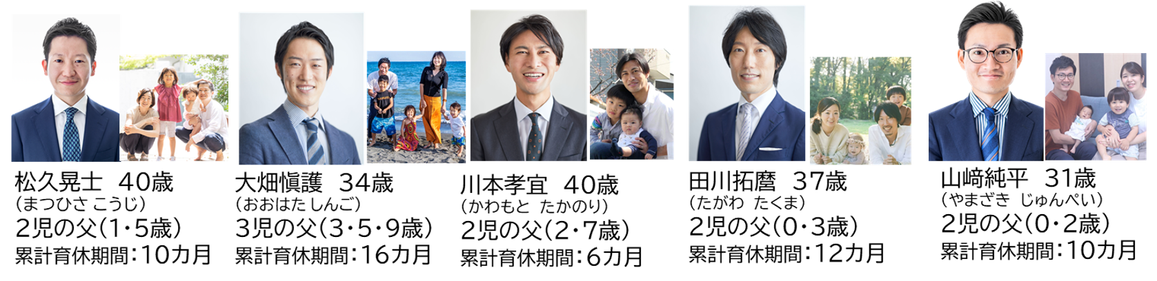 講師陣は全員が半年以上の育休取得経験があります。働き方改革コンサルで数多くの企業を担当する、30~40代の子育て現役世代(末子が0歳~3歳)。