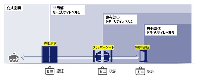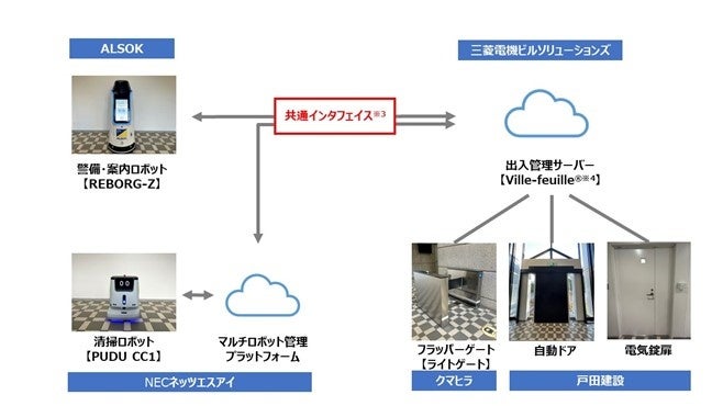 当社筑波技術研究所において、3つのセキュリティ扉(自動ドア・フラッパーゲート・電気錠扉)と2台のロボット(①警備(案内):REBORG-Z、②清掃:PUDU CC1)が、共通のインタフェイス※3を活用してセキュリティ扉の開閉を制御する「出入管理サーバー(Ville-feuille®※4) 」と連携動作させることで、2台のロボットはセキュリティレベルの異なるエリア間を自律移動しました(図1、2)。