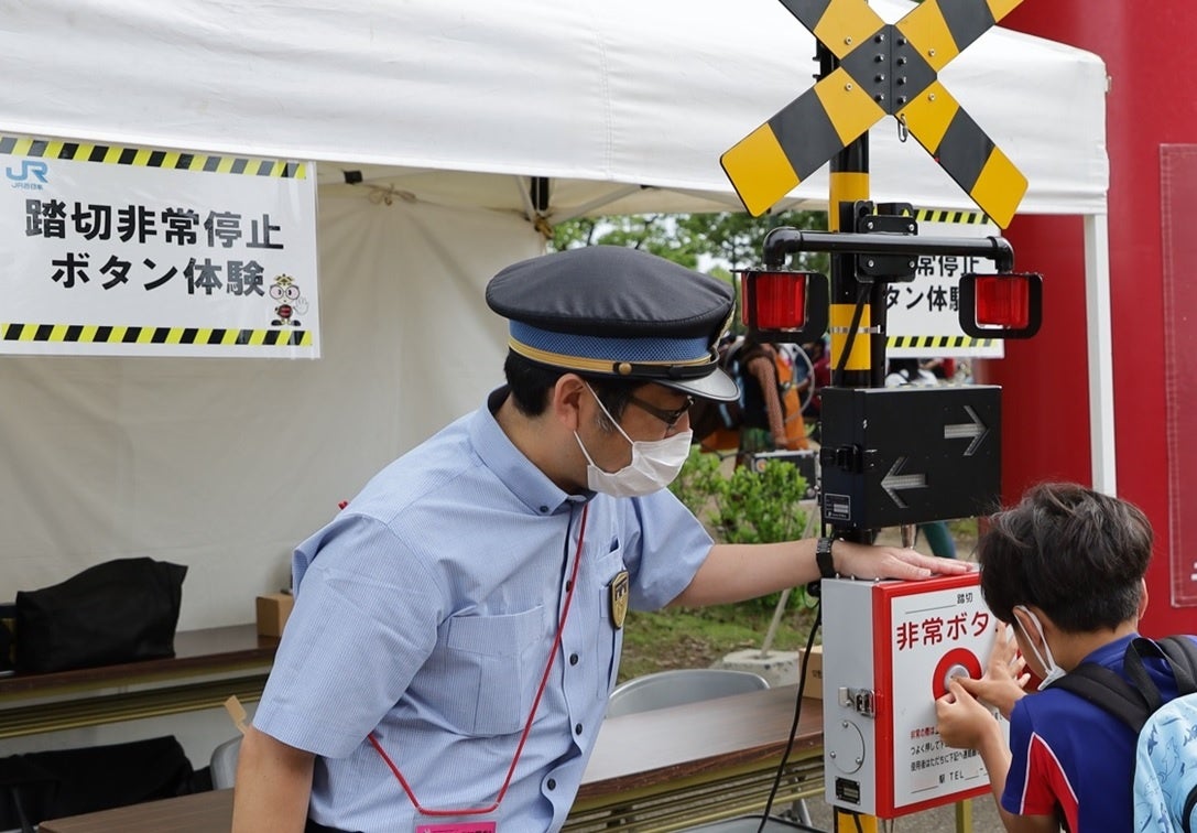 夏休み期間中のお子さまや、日ごろ鉄道をご利用のお客さまへ踏切事故防止の啓発活動として、踏切模擬体験イベントを実施いたします。踏切内で異常があった際に運転士に危険を知らせる「踏切非常ボタン」の使用方法などを体験することができます。