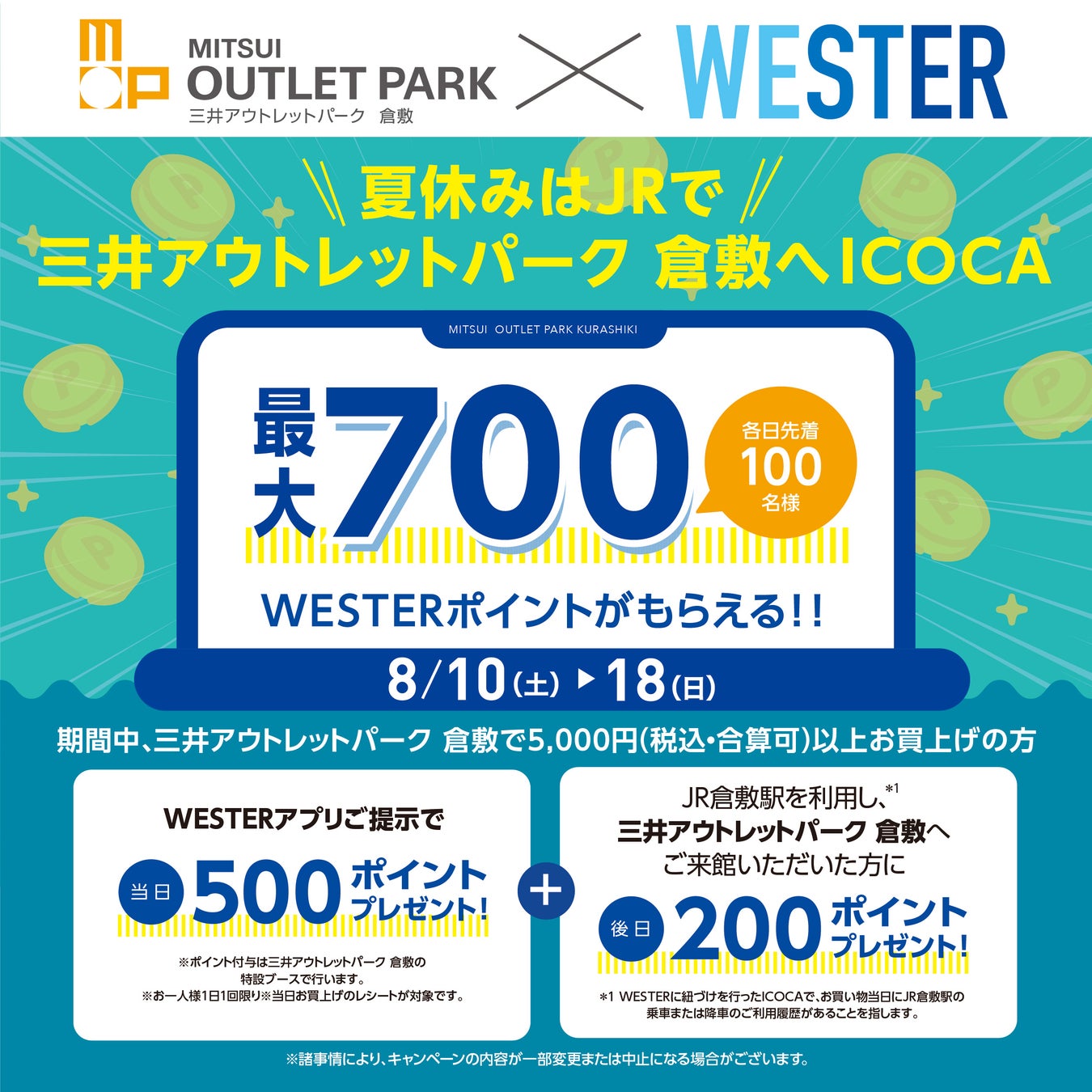 当日、三井アウトレットパーク 倉敷にて5,000円(税込・合算可)以上お買い上げ、かつWESTERアプリご提示で当日WESTERポイント500ポイントをプレゼントいたします。さらに、当日鉄道利用(JR倉敷駅)し、来館いただいた方にはWESTERポイント200ポイントを後日プレゼントいたします。