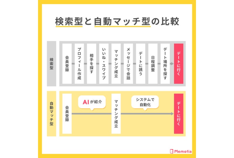 しかし自動マッチ型のマッチングアプリでは、マッチング成立までの行程を全てAIが行い、デートまでの必要な工程もシステムが代行するため、ほぼ全ての人がデート(メモティアの場合はメタバースデート)を行うことができます。
