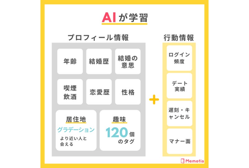 メモティアのAIマッチングでは、プロフィール入力項目のほか、ユーザーのログイン頻度や遅刻、キャンセル率などのマナー面までAIが学習しています。