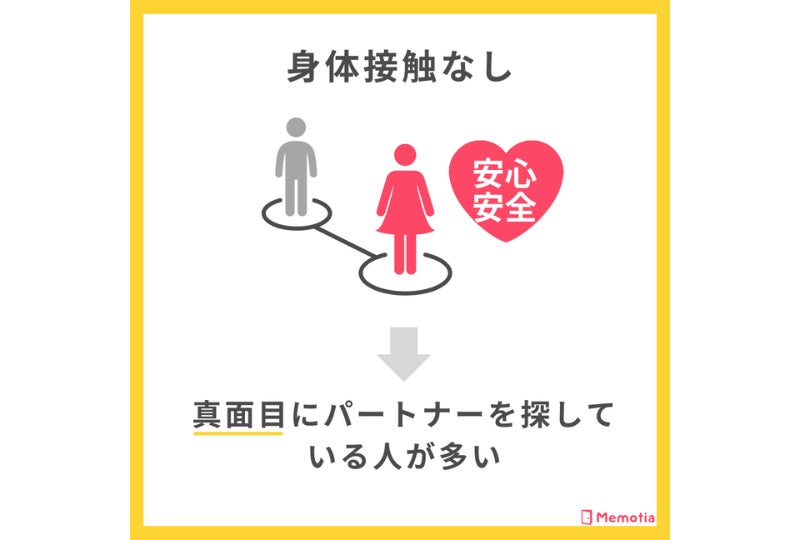 メタバース上でデートを行うため身体接触がなく、安心して安全に相手を探すことができます。また、実際に会うまでに時間がかかるため、遊び目的の人には利用しづらく、真面目にパートナーを探している人が利用しやすい仕組みとなっています。