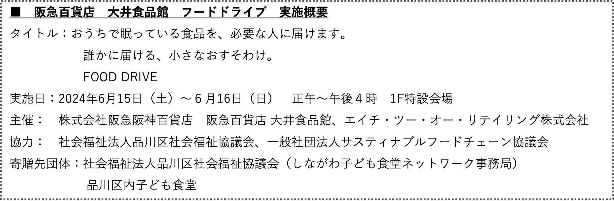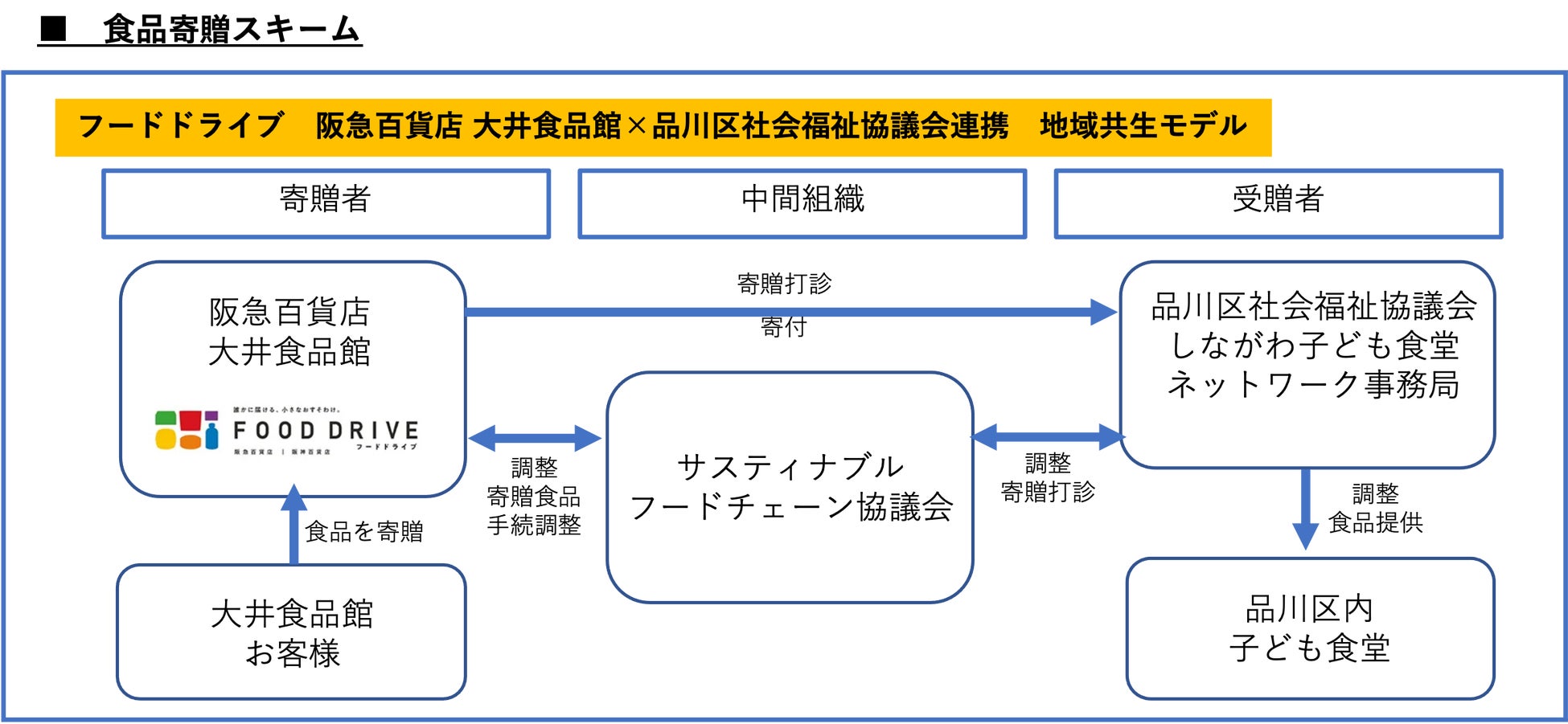 一般社団法人サスティナブルフードチェーン協議会(東京都千代⽥区/代表理事:⼩林富雄/略称:SFA)は、東京都大学提案 専修大学受託事業「未来を担う子どもたちへの食品寄贈事業」において、一般の方々の良心のこもった寄贈食品を子どもたちに寄贈する「フードドライブ」の実施を促進するため、エイチ・ツー・オーリテイリング株式会社のグループ会社、株式会社阪急阪神百貨店(本社:大阪府大阪市)が運営する阪急百貨店大井食品館(東京都品川区)が、関東で初めて開催するフードドライブ活動を支援しました。