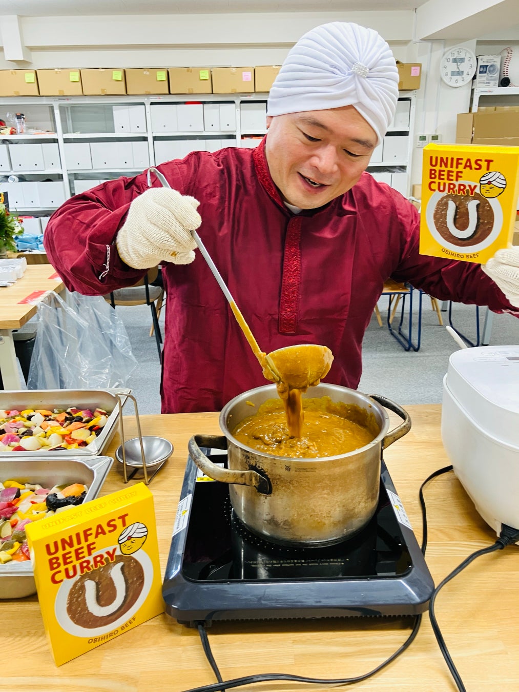 新年度の始業日となる2025年1月6日(月)に、新年会を兼ねた社内カレー試食会を開催いたしました。社長の橋本が白いターバンと赤いインド風衣装に身を包み、インド人シェフに扮して自社オリジナルレトルトカレーを全社員に振る舞いました。カレーをテーマにした楽しい演出により、終始和やかな雰囲気に包まれた試食会となりました。「社員一人ひとりが実際に味わい、その体験を顧客への提案に活かしてほしい」と橋本が呼びかけました。