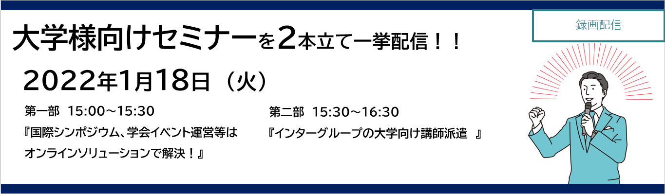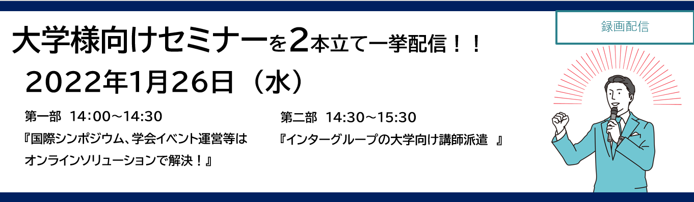 【1/26 開催】 アンコールにつき、一挙配信!! 『国際シンポジウム、学会イベント運営はオンラインソリューションで解決!!』 『インターグループの大学向け講師派遣 』(無料)