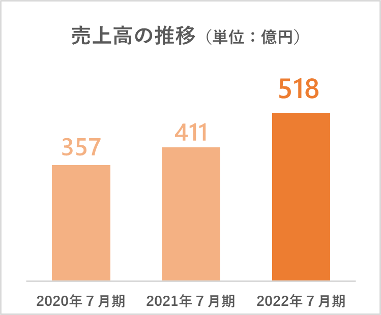 2022年7月期の売上高は518億円(前期比+26%増)