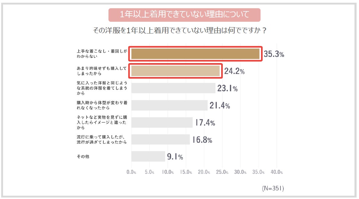 その理由としては、「上手な着こなし・着回しがわからないから」が35.3%、「あまり吟味せずに購入してしまったから」が24.2%となり、服を購入したものの、うまく自分に合った形で着こなすことができていないために、着用できなくなってしまっているという実態が明らかになりました。