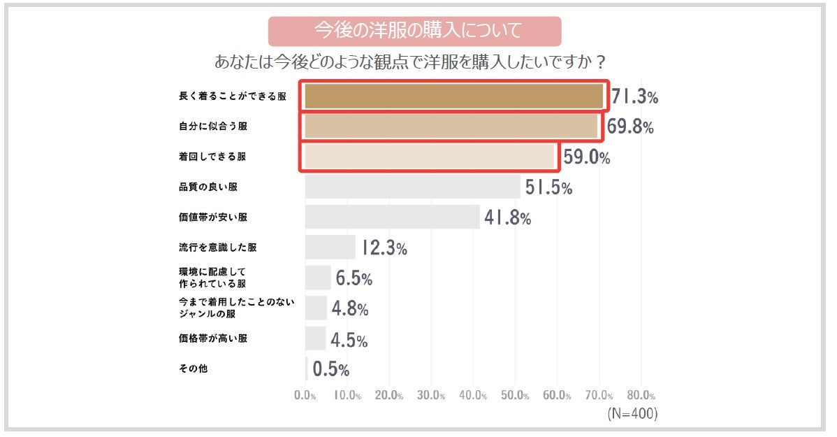 また、今後服を購入するにあたり重視したい点については、「長く着ることができる服」が71.3%、「自分に似合う服」が69.8%、「着回しできる服」が 59.0%となり、「迷子服」にならずに、有効活用できるような洋服の購入意向が高いことが明らかになりました。