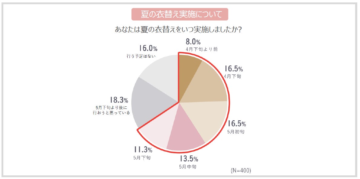 夏を迎えるにあたり、8割以上の人が衣替えを実施、または実施する意向があり、65.8%の人が5月下旬までに衣替えを実施済みであることが明らかになりました。一方で、衣替えを行う予定がないという人も16.0%いる結果となり、季節の変わり目に、必ずしも衣替えをすべての人が行うわけではないということがわかりました。
