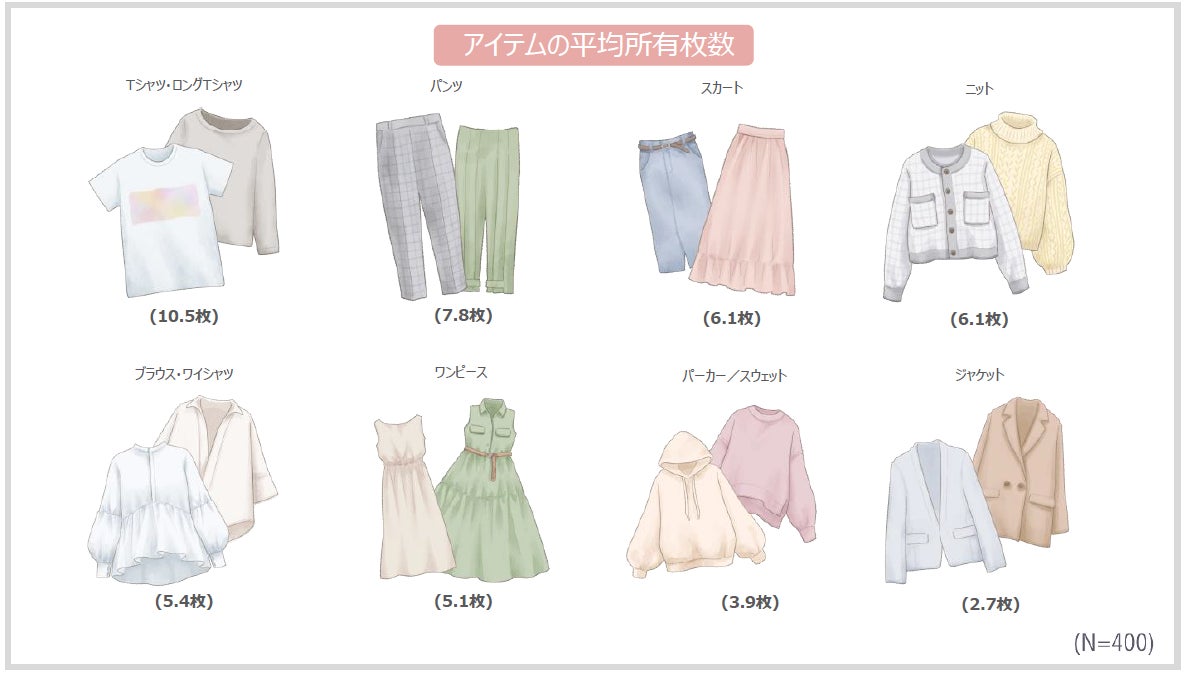 ※:Tシャツ・ロングTシャツ 、ニット、ジャケット、パーカー/スウェット、ブラウス・ワイシャツ、 ワンピース、パンツ、スカートのみの合計平均所有枚数