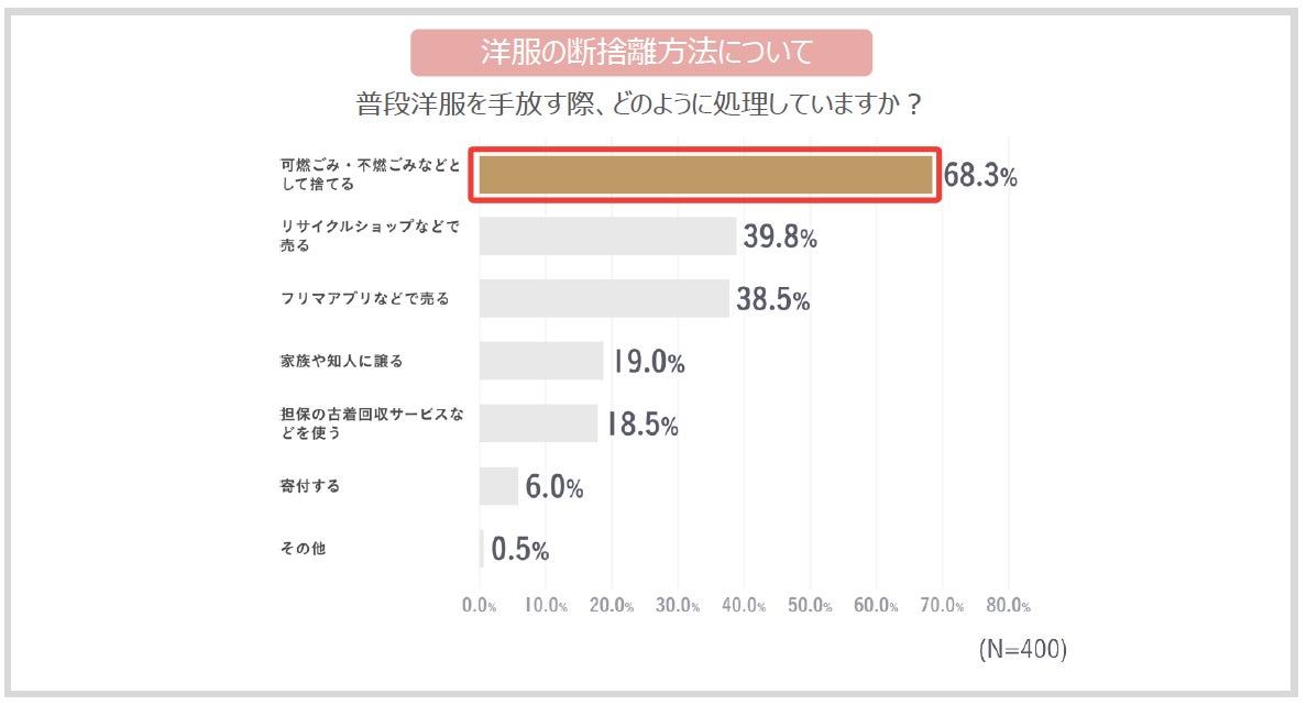 普段洋服を手放す手段について、「可燃ごみ・不燃ごみなどとして捨てる」が最も多い68.3%となり、次いで「リサイクルショップなどで売る」が39.8%、「フリマアプリなどで売る」が38.5%で、服を捨てるのではなく2次活用できる形で処理する人も多いものの、「捨てる」という選択をしてしまう人もまだ多くいることが明らかになりました。