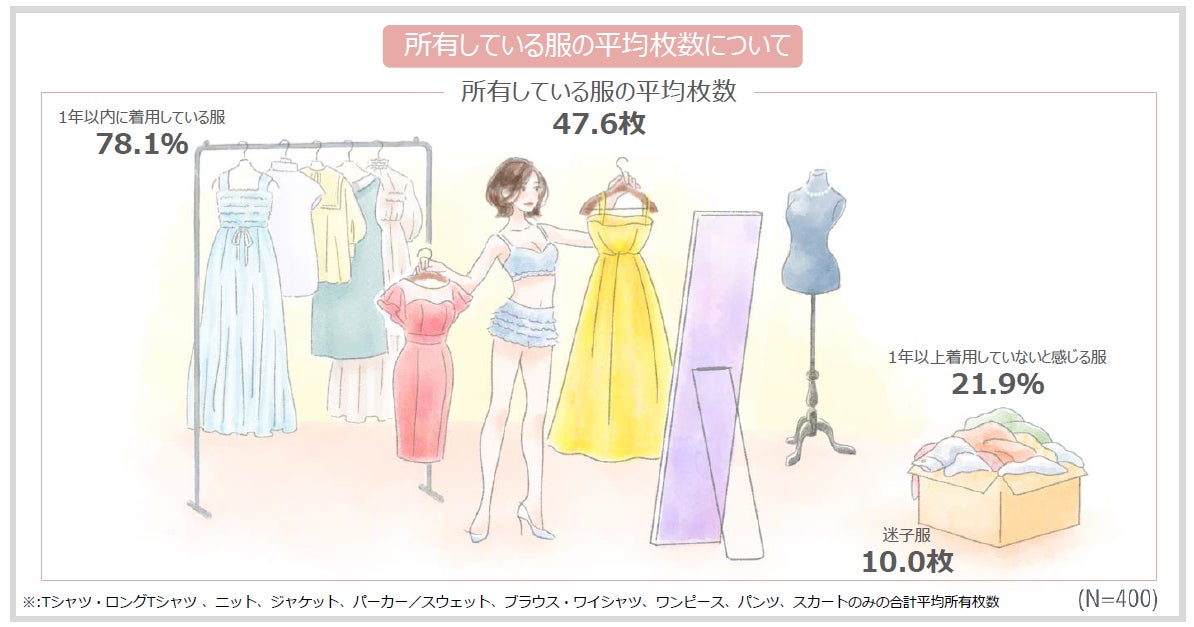 所有している服の中で、1年以上着用していない服があると回答した人が約9割となり、多くの人が所有している洋服をフル活用できていないことが明らかになりました。また、実際に所有している服の枚数を聞いたところ、平均で47.6枚※という結果になりました。また、その内の1年以上着用していないと感じる服の枚数は、平均で10.0枚となり、5枚に1枚が1年以上着用していない行き場を失った「迷子服」となっていることがわかりました。