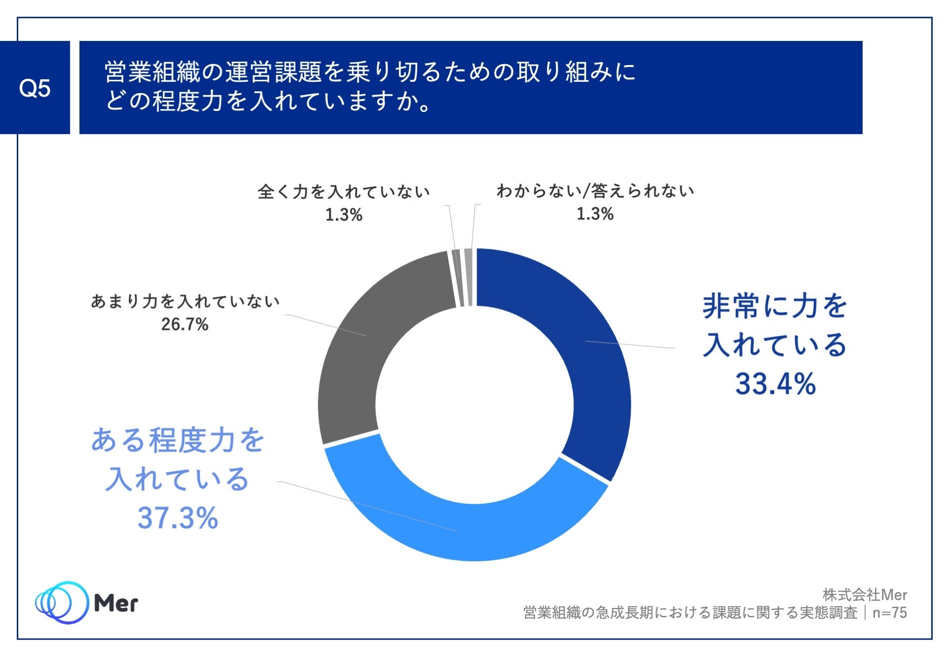 Q1で「非常に深刻に感じている」「ある程度深刻に感じている」と回答した方に、「Q5.営業組織の運営課題を乗り切るための取り組みにどの程度力を入れていますか。」(n=75)と質問したところ、「非常に力を入れている」が33.4%、「ある程度力を入れている」が37.3%という回答となりました。