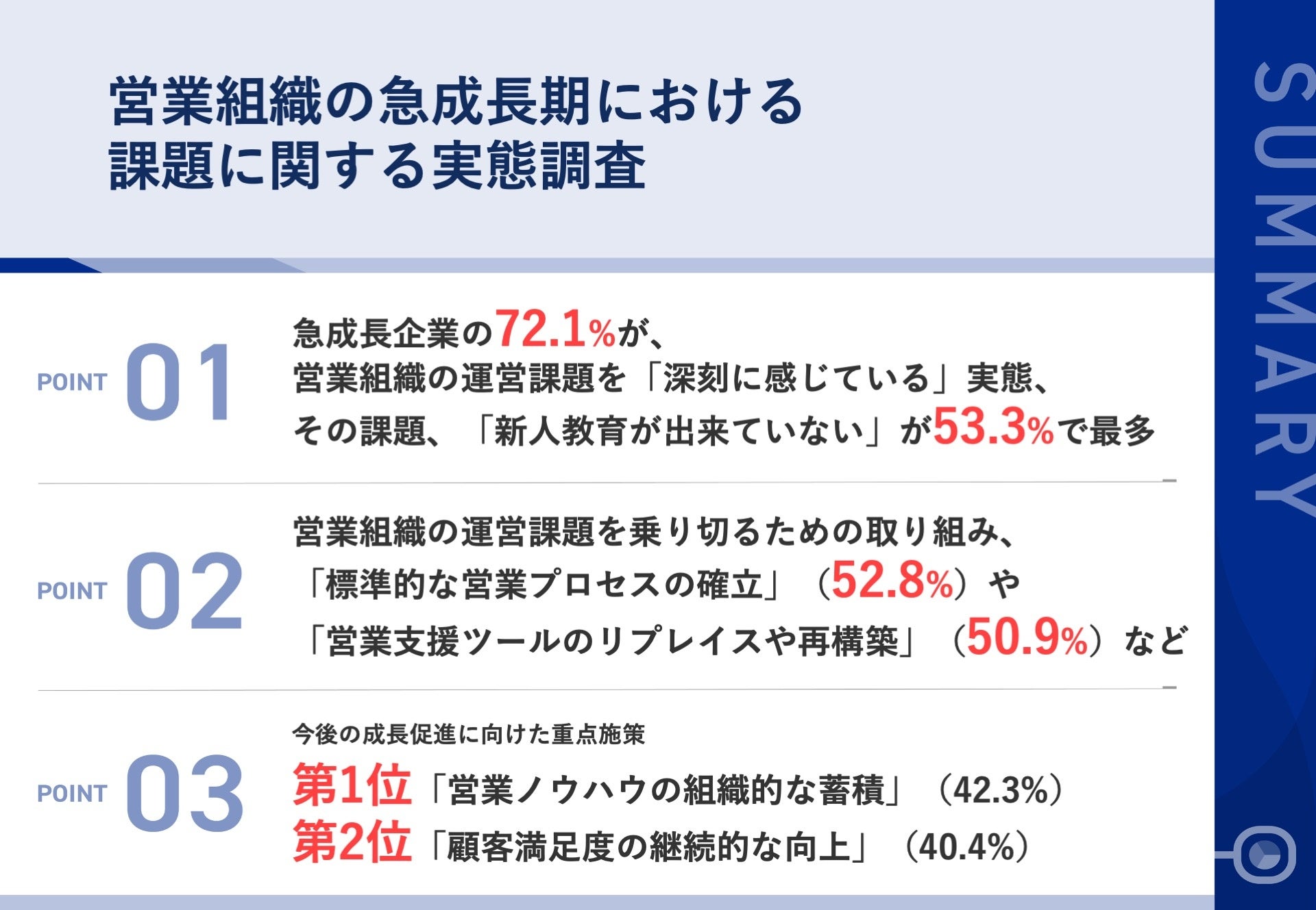 01|急成長企業の72.1%が、営業組織の運営課題を「深刻に感じている」実態、その課題、「新人教育が出来ていない」が53.3%で最多