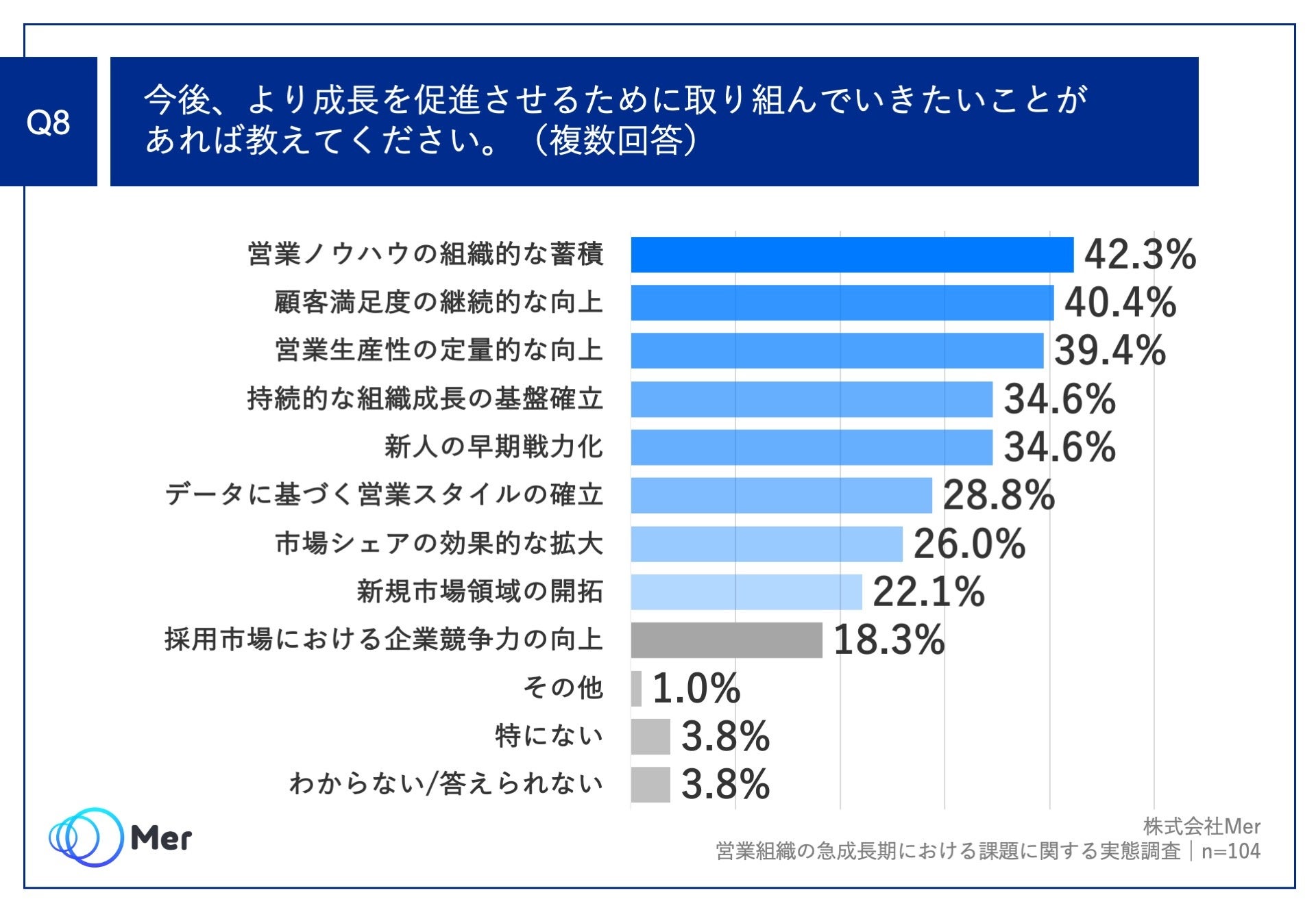 「Q8.今後、より成長を促進させるために取り組んでいきたいことがあれば教えてください。(複数回答)」(n=104)と質問したところ、「営業ノウハウの組織的な蓄積」が42.3%、「顧客満足度の継続的な向上」が40.4%、「営業生産性の定量的な向上」が39.4%という回答となりました。