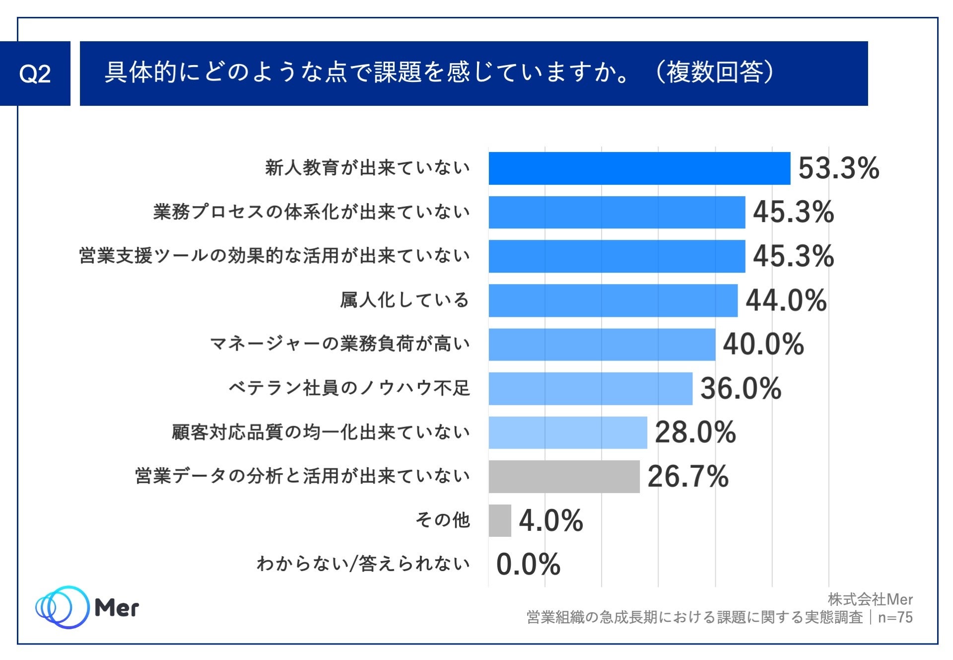 Q1で「非常に深刻に感じている」「ある程度深刻に感じている」と回答した方に、「Q2.具体的にどのような点で課題を感じていますか。(複数回答)」(n=75)と質問したところ、「新人教育が出来ていない」が53.3%、「業務プロセスの体系化が出来ていない」が45.3%、「営業支援ツールの効果的な活用が出来ていない」が45.3%という回答となりました。