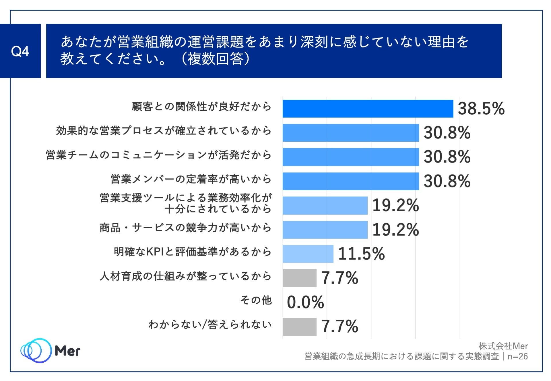 Q1で「あまり深刻には感じていない」「全く深刻には感じていない」と回答した方に、「Q4.あなたが営業組織の運営課題をあまり深刻に感じていない理由を教えてください。(複数回答)」(n=26)と質問したところ、「顧客との関係性が良好だから」が38.5%、「効果的な営業プロセスが確立されているから」が30.8%、「営業チームのコミュニケーションが活発だから」が30.8%、「営業メンバーの定着率が高いから」が30.8%という回答となりました。