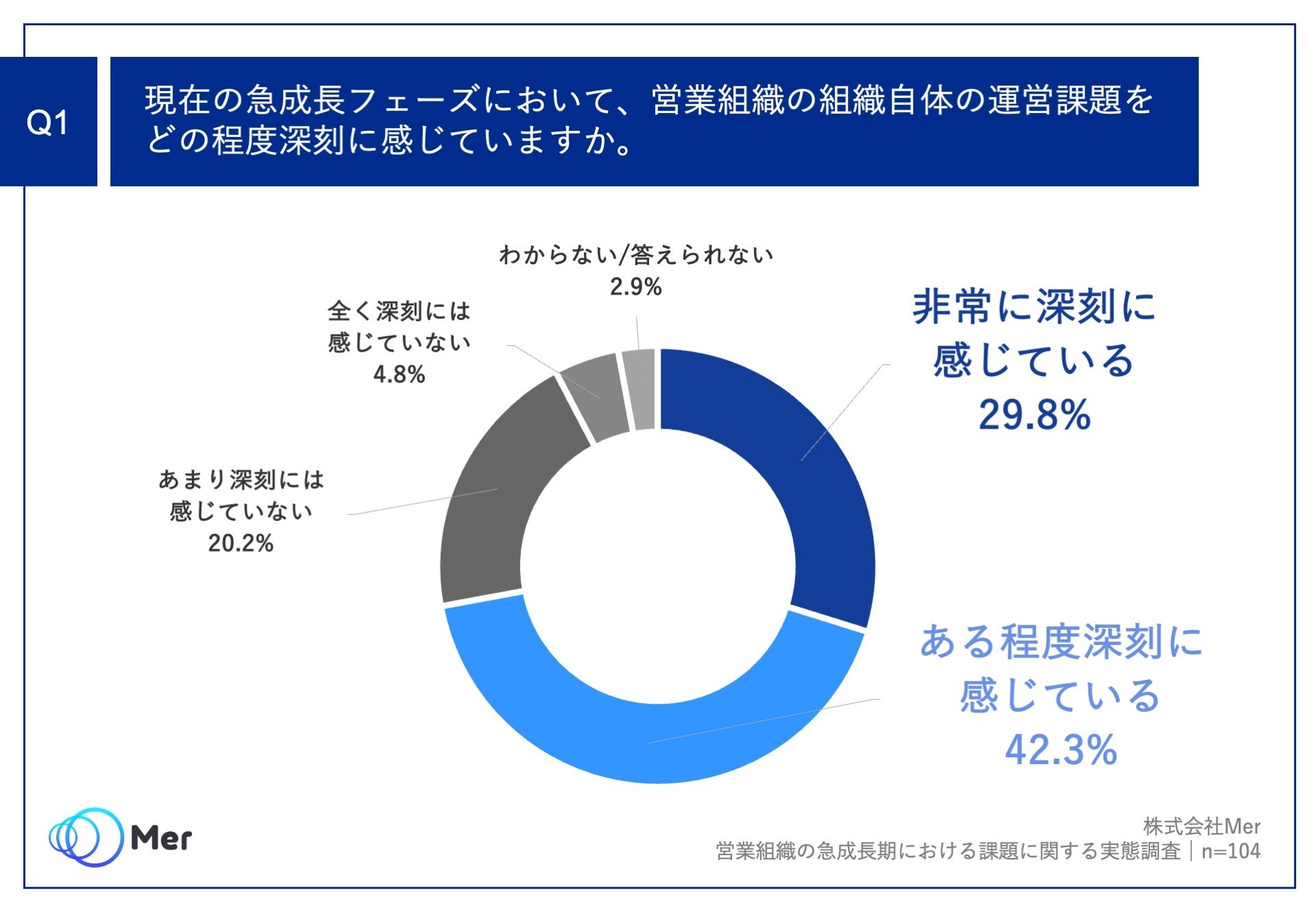 株式会社Mer(本社:東京都渋谷区、代表取締役:澤口 友彰、以下Mer)は、売上が3期以上連続で成長し、年間売上が10億円以上の企業に勤める営業責任者もしくは営業マネージャー104名を対象に、営業組織の急成長期における課題に関する実態調査を実施しましたので、お知らせいたします。