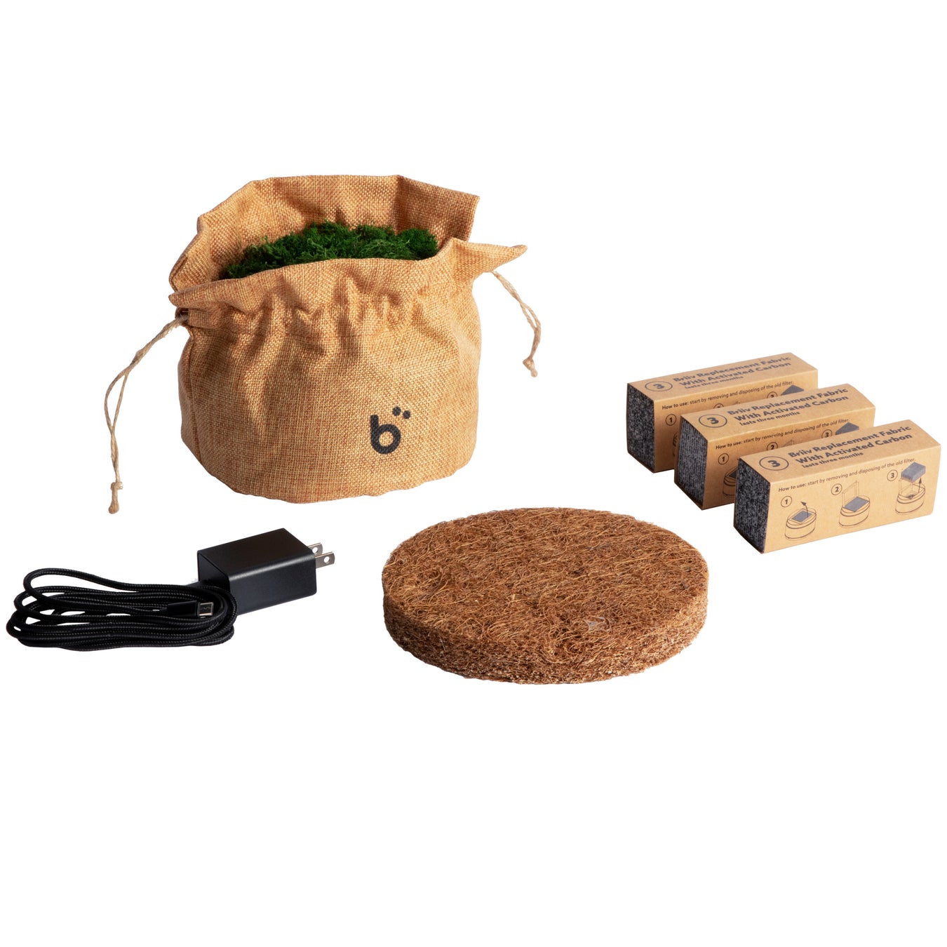 フィルターの素材には、コケ、ココナッツ、活性炭の天然素材が使用されています。空気清浄機全体としても、ほとんどの素材がリサイクル・堆肥化可能です。フィルターに使用されているコケ、ココナッツ、パッケージのダンボールは、堆肥としてガーデニング等での再利用も可能です。リニューアルのタイミングで、付属のナノマトリックスフィルターが1本から4本入りに変更され、ますます便利になりました。