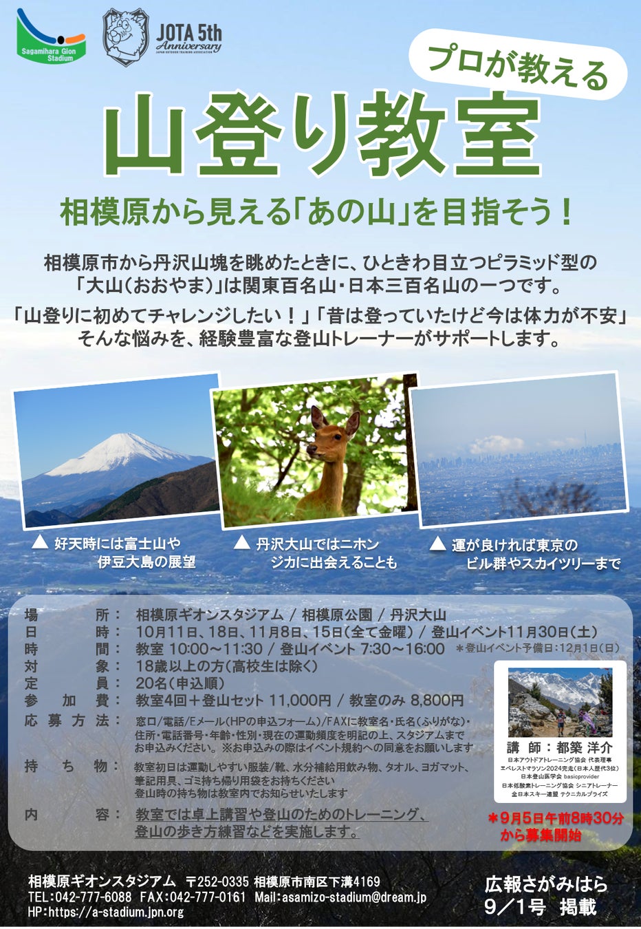 日本アウトドアトレーニング協会は相模原市スポーツ協会グループとの共同主催で令和6年10月11日(金)10時~、全4回(+登山イベント当日の合わせて5日間)の「プロが教える山登り教室」を開催いたします。このイベントは日本アウトドアトレーニング協会がランニングクリニックを開催している "相模原ギオンスタジアム" で初めて実施する登山企画です。