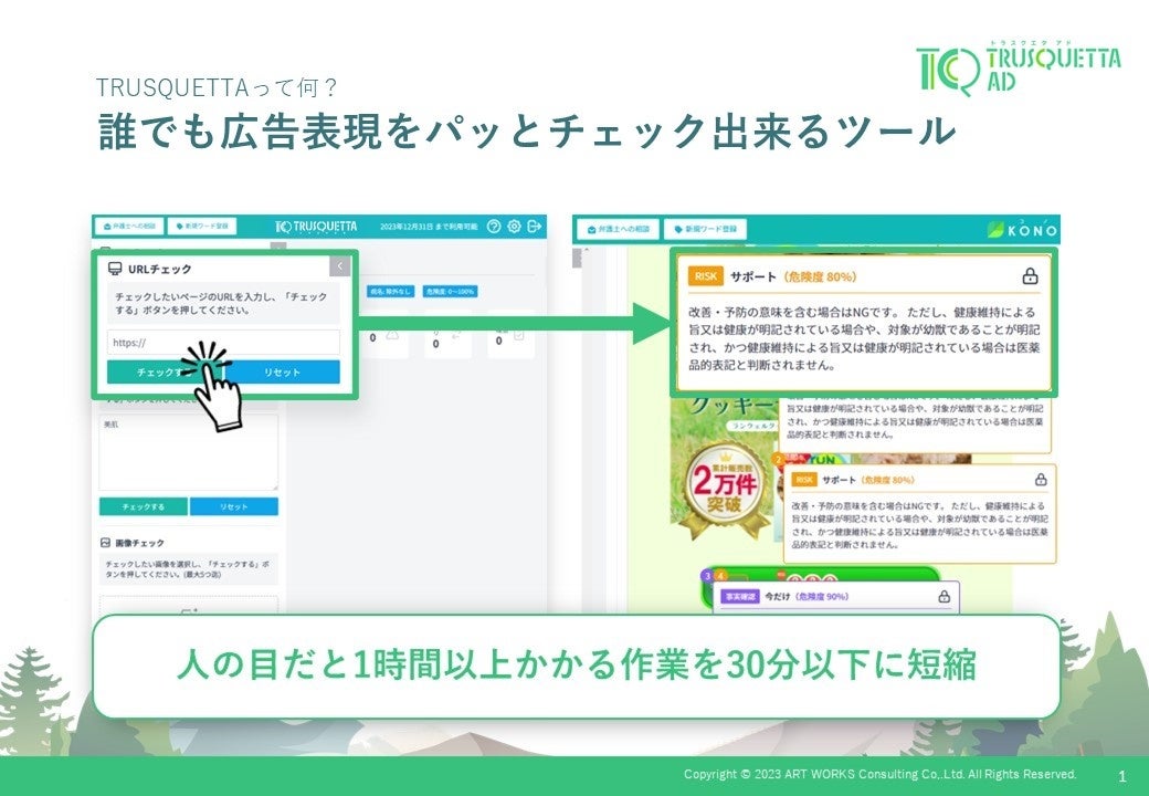 広告チェックに適した『TRUSQUETTA AD(トラスクエタ アド)』や、チェックしたいURLを複数登録し、モニタリングが可能な『TRUSQUETTA EYES(トラスクエタ アイズ)』、動画チェックができる『TRUSQUETTA MOVIE(トラスクエタ ムービー)』など、様々なチェックツールを提供しております。