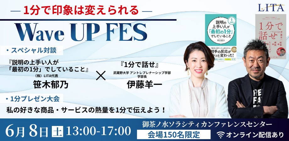 6/8(土) 1分で商品やサービスの魅力を伝える「1分プレゼン大会」開催 『1分で話せ』の著者伊藤羊一氏、PRプロデューサーLITA代表笹木郁乃が審査員として登壇。