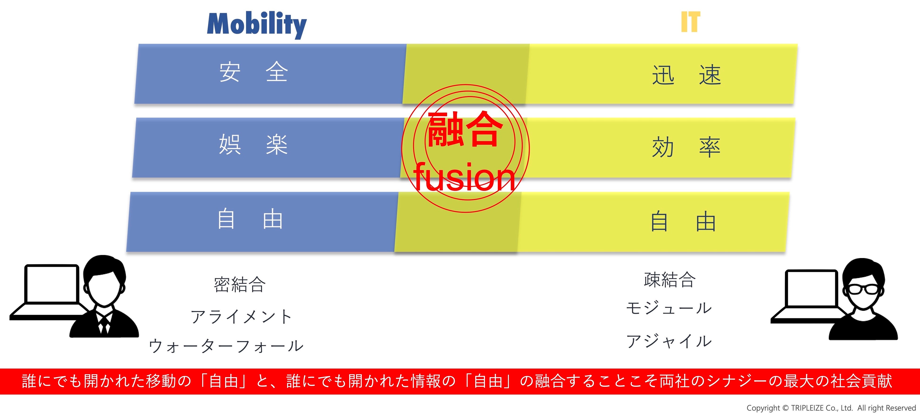 さらに両社は未来の技術を創るエンジニアの育成にも努めます。自動車メーカーは製品全体の最適化を重視し設計から生産まで密結合されたプロセスを採用しています。一方でIT業界は、モジュール化された疎結合の開発が一般的です。これらの設計思想、生産工程の違いを融合し新たなエンジニア育成をしていきます。「安全」「娯楽」「自由」を提供するモビリティと「迅速」「効率」「自由」を提供するITシステムの融合によって社会貢献に取り組みます。