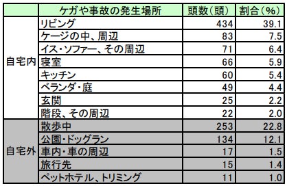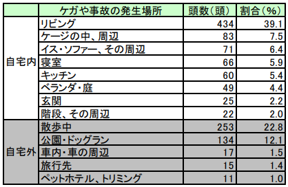 アニコム損害保険会社による調査では、約47.7%のペットが何らかのケガや事故を経験していることが報告されています。発生場所として最も多かったのは「リビング(39.1%)」で、ペットが日常的に過ごす室内環境での事故が多いことが明らかになっています。また、自宅外では「散歩中(22.8%)」での事故が多く見られました。