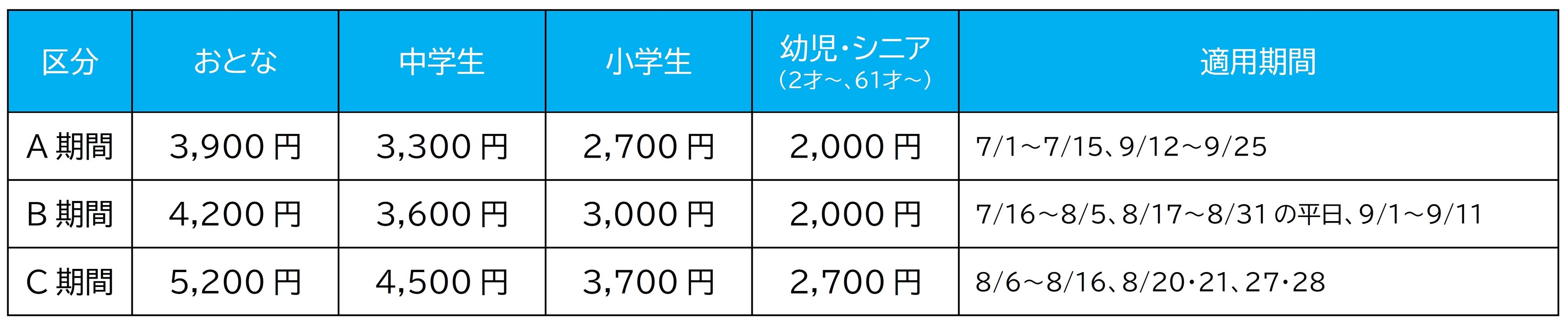 ■【1Dayパス】 料金のご案内(税込) ※2022年7月1日~9月25日