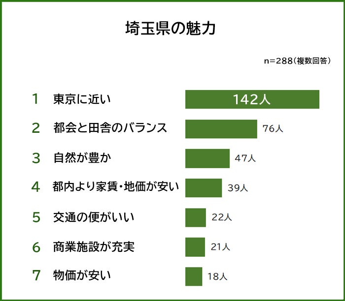 全国の男女288名に「埼玉県の魅力」を聞いたところ、1位は「東京に近い(142人)」でした。