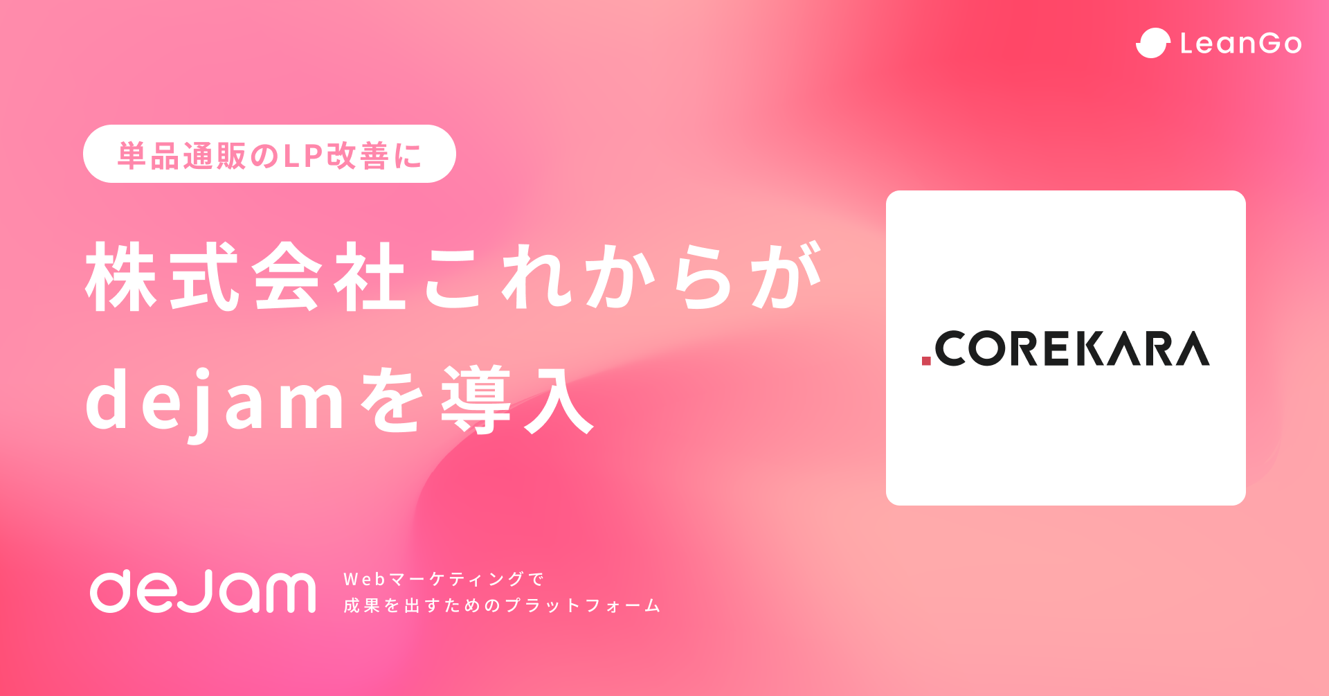 株式会社LeanGo(本社:東京都品川区、代表取締役:平井 翔吏、以下 LeanGo)は、株式会社これから(本社:東京都新宿区、代表取締役:今泉 雄介)へ、Webマーケティングで成果を出すためのプラットフォームdejamが導入されたことをお知らせします。 https://leango.co.jp/dejam/?utm_source=prtimes&utm_medium=pressrelease&utm_campaign=20220718