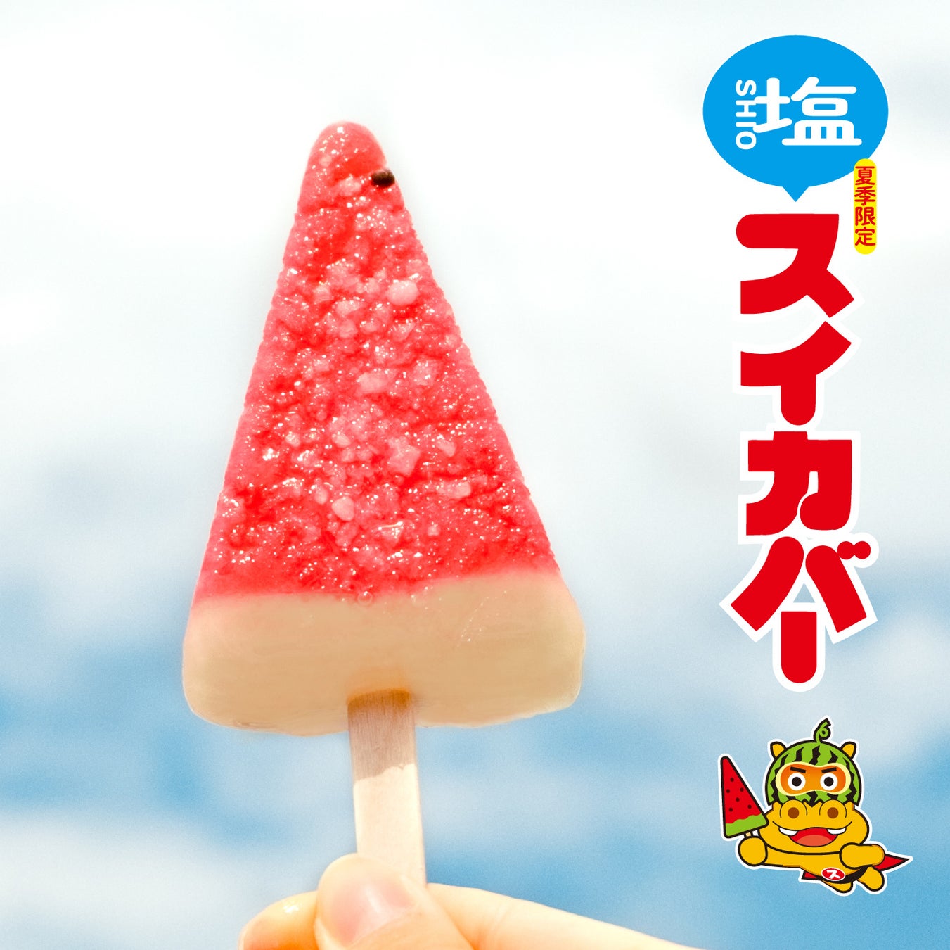 スイカと塩の相性がぴったりなのはみなさんご存知のはず! いつものおいしいスイカバーに、特有のスイカ感と甘さをぐわっと引き立てるオリジナルのブレンド塩をかけました。甘い!しょっぱい!甘い!しょっぱい! いちど食べたら止まらない。真夏に食べたい「塩スイカバー」です!