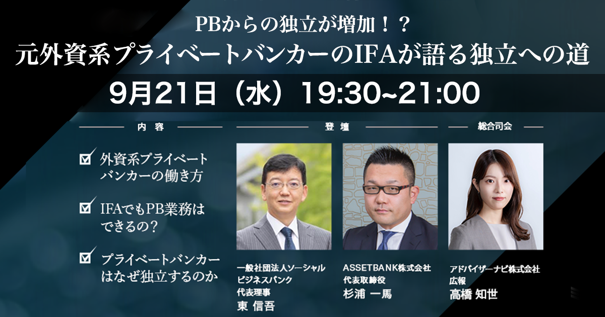 「PBからの独立が増加!?元外資系プライベートバンカーのIFAが語る独立への道」ウェビナー開催のお知らせ