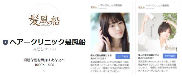 LINE公式アカウントの開設以降、友だちの増加ペースは1日あたり2, 3人程度だったが、2017年には友だち数も約3,000人で限界が見えてきた。そのときに友達追加広告の存在を知り、試験的に運用したことが始まりである。そして現在に至るまで友達追加広告を活用して集客を行っている。使用するクリエイティブは訴求軸を変えて制作し、複数の広告を配信した上でその効果を比較してる。「手の込んだデザインやラグジュアリー感のあるものより、シンプルで清潔感のあるクリエイティブのほうが配信効果が高くなる傾向にある」といい、クリエイティブの勝ちパターンを模索しながら「友だち追加広告」の運用を続けた結果、2021年12月時点で81,000人を超える友だちを集めることに成功。友達獲得単価(CPF)は幅はあるものの平均で50円ほどである。客単価が12,000円のため、費用対効果は高いとのことである。